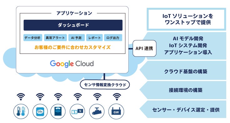 MAIDOA plusは、さまざまなセンサー機器から伝送されるデータをクラウド上に取り込むためのインターフェイスを搭載し、センサーから収集したデータをAPI連携できる機能を提供します。現在、50種類以上のセンサーに対応し、今後さらに対応センサーを増やすことで1年以内に100種類以上のセンサーに対応する予定です。