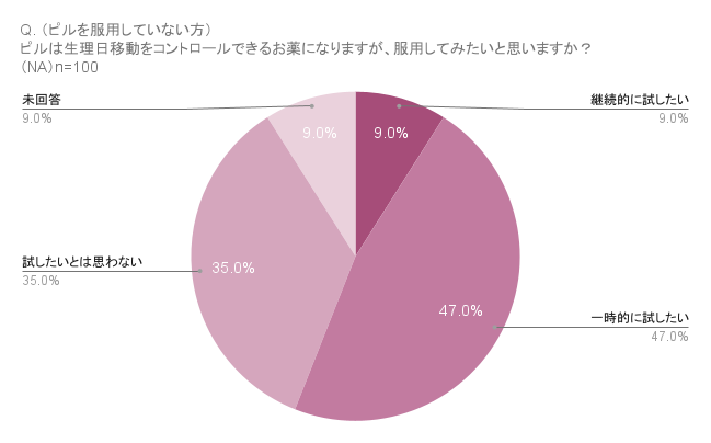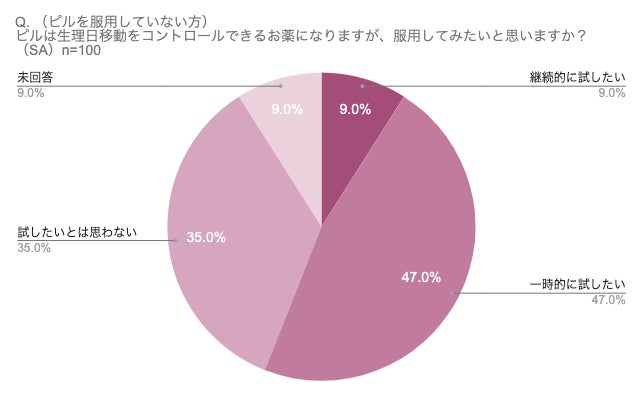 ・「海や温泉にいくときは、生理が被らないような日程調整をしています。複数人の女性で旅行にいくと、そのような目的での日程調整が難しいこともあるのでピルを服用してみたいです。」(20代前半・会社員)