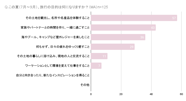 - この夏(7〜9月)の旅行目的、第1位は「その土地を観光し、名所や名産品を体験すること」(約46%)。