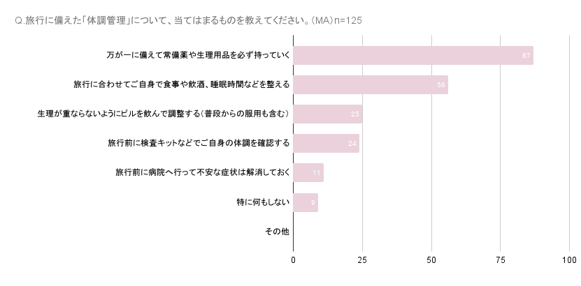 3.旅行に備えて事前に体調管理を行なっている女性は全体の約93%にのぼる。さらに全体の20%がピルを服用している。常備薬や生理用品は7割以上が持参する「必須アイテム」と言える。