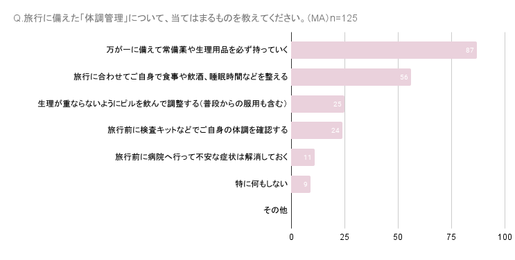 ・「なるべく旅行中に生理を気にしたくないので、日頃からピルを服用しているため自己調整をしています。特にリゾート地や温泉に行く場合は意識をしています。」(30代前半・会社員)