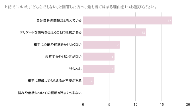 - 旅行にまつわる「生理/PMSのお悩み」について、パートナーや家族にも共有する人は60%。また、共有しない理由、第1位は「自分自身の問題だと考えている」から。