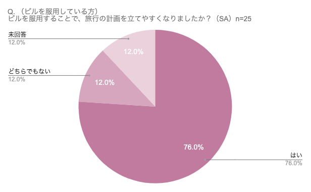 6.ピルを服用している女性のうち約76%が「ピルを服用することで、旅行の計画を立てやすくなった」と感じている。またピルを服用していない女性の約56%がピルを「一時的に試したい」または「継続的に試したい」と回答。