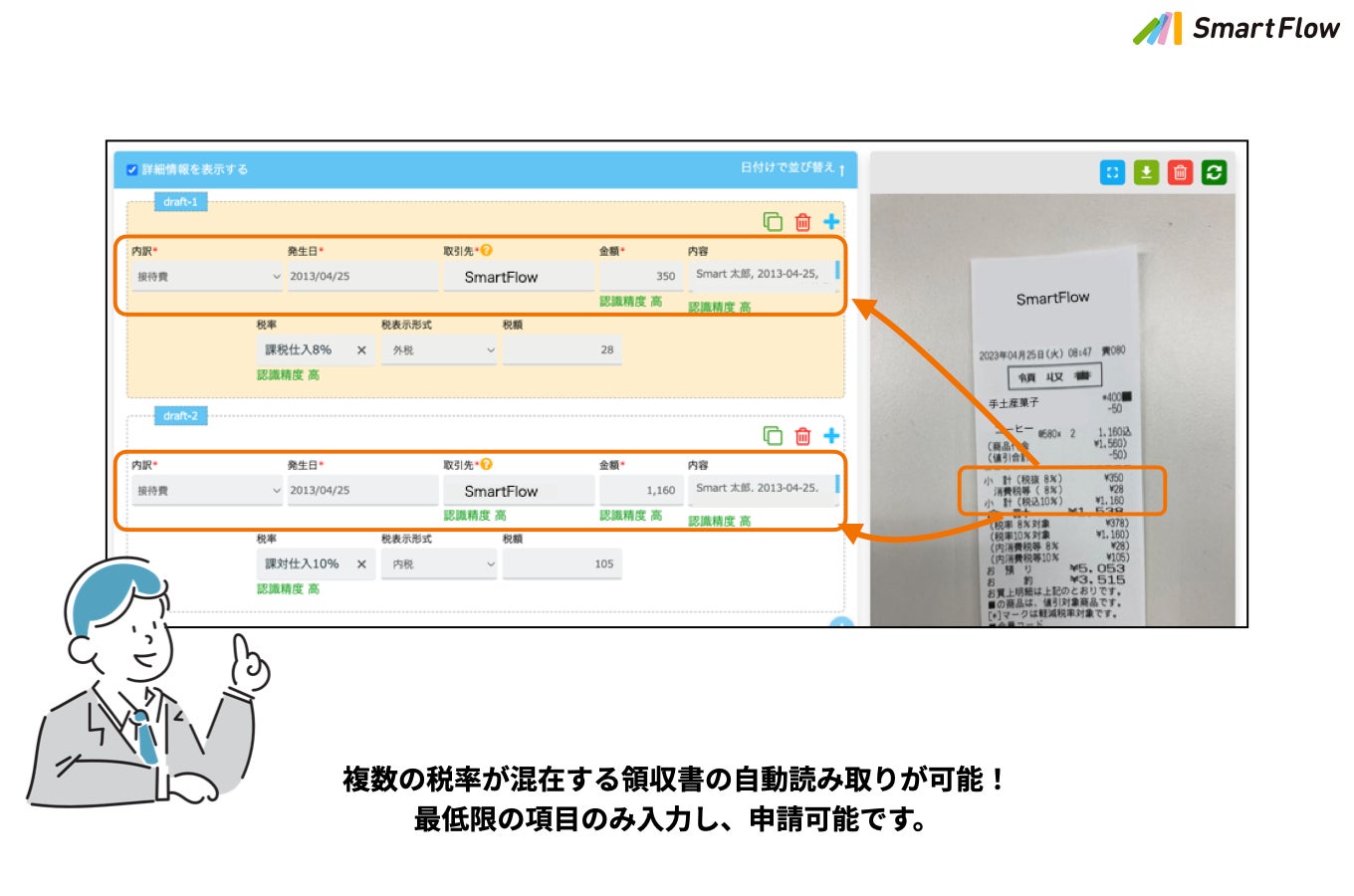 SmartFlow経費精算、AI-OCR機能のアップデートで複数の税率が混在する領収書の自動読み取りが可能に