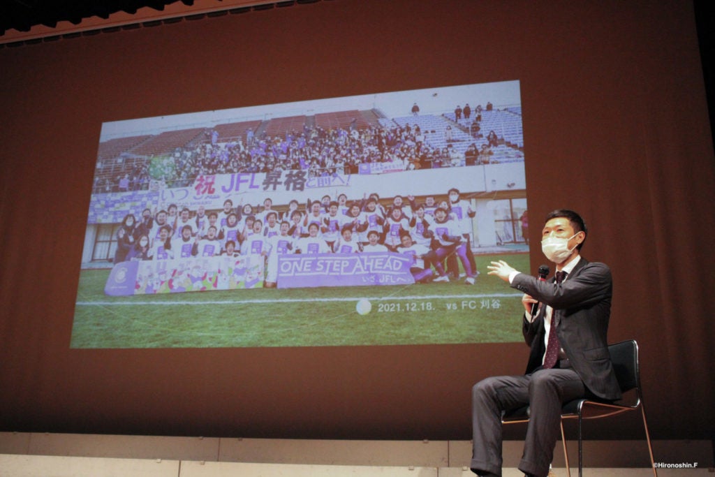 最後の「クリアソン新宿の2022シーズン」では、選手兼運営統括部門長の原田から、JFLという全国リーグへの参入でさらに厳しくなるビジネスとの両立や、J3昇格の条件について説明をしました。