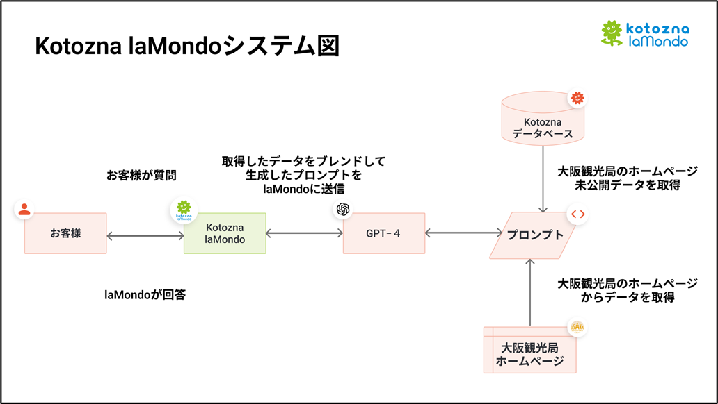 今回導入する、Kotozna株式会社(本社:東京都港区、代表取締役 後藤玄利、以下、Kotozna)が株式会社JTB(本社:東京都品川区、代表取締役 社長執行役員:山北栄二郎、以下、JTB)と連携して提供する、多言語生成系AIチャットボット「Kotozna laMondo(コトツナ ラモンド)」を、2023年10月16日(月)より「OSAKA-INFO」に導入し、今後大阪観光局公式・観光アプリ「Discover Osaka」にも搭載していきます。