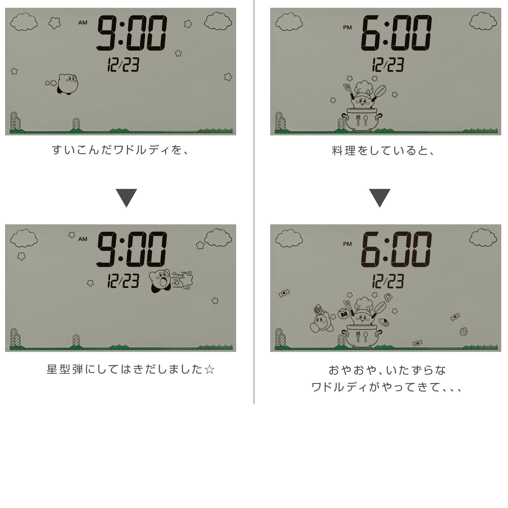 時刻ごとに異なった全12種類のアニメーションが楽しめ、カービィファンにはたまらないデジタル時計です。