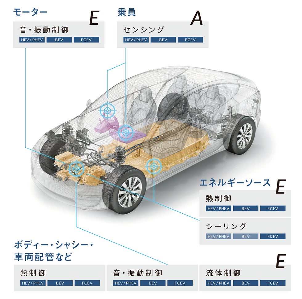 市場の要望にお応えするための製品開発・供給体制を整備し、現在では世界20ヶ国以上で事業を展開するグローバル企業として、さらにその歩みを加速させています。防振ゴム、ホース、制遮音品や内装品など自動車関連製品に加えて、インフラや住環境、エレクトロニクスやヘルスケアに至る様々な領域で製品を開発しています。