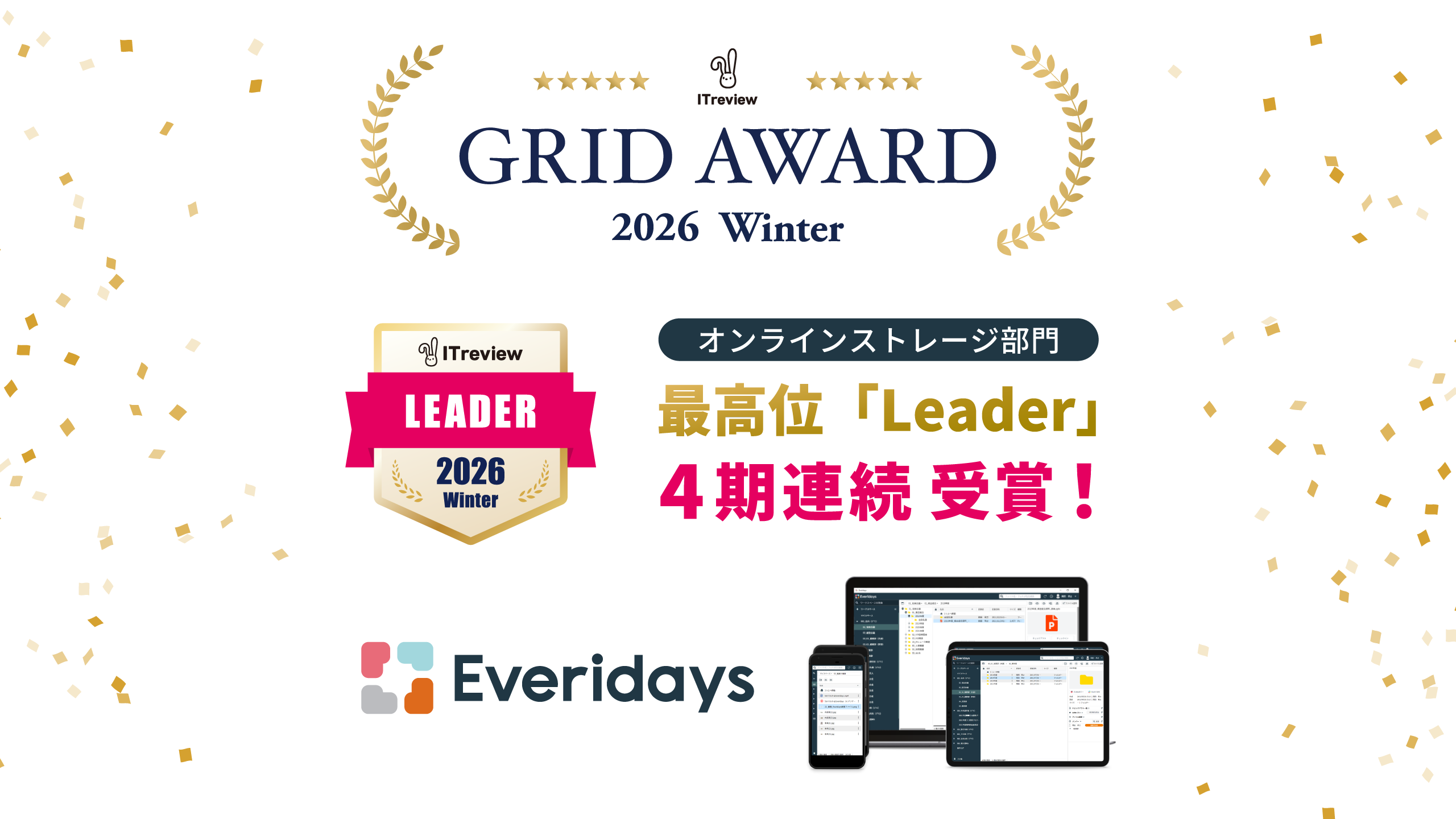 Everidaysが、「ITreview Grid Award 2026 Winter」にてオンラインストレージ部門「Leader」を4期連続受賞