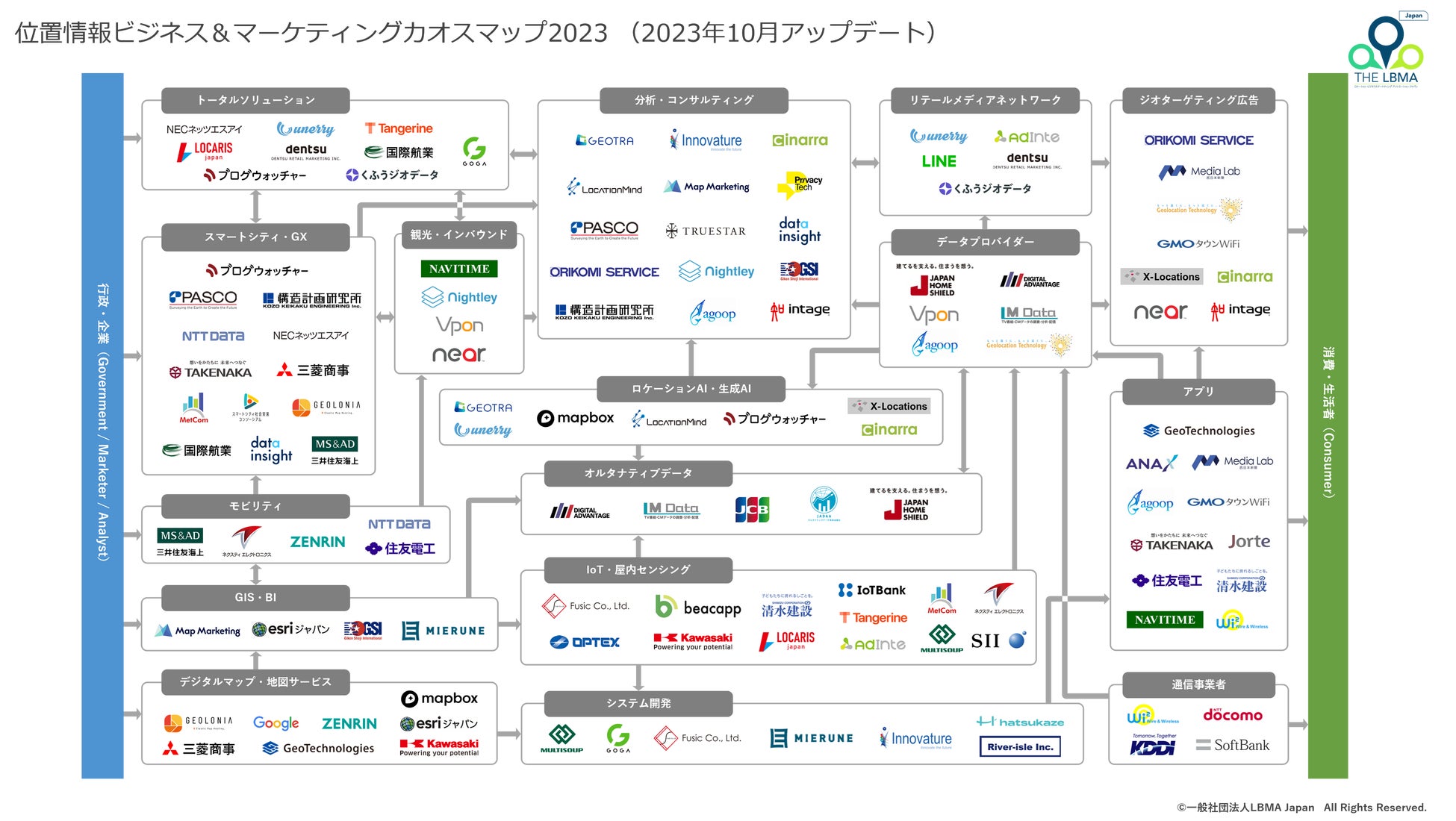 位置情報を活用したマーケティングやサービス施策の促進を目的に活動する65社の企業連合である、一般社団法人LBMA Japan(東京都千代田区/代表理事:川島邦之)は、日本国内に於ける位置情報サービスを展開する企業を中心としたカオスマップの2023年版を作成しましたので、公開致します。