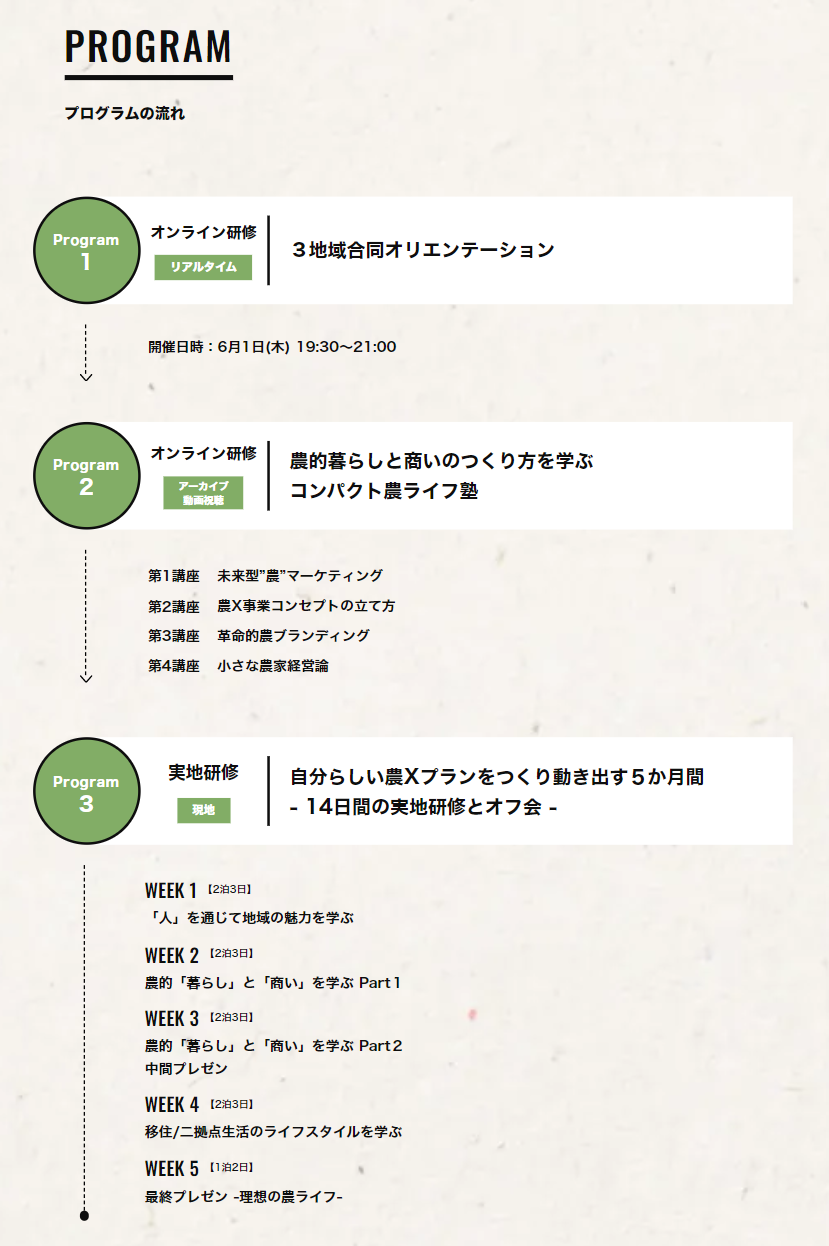 農ライファーズ株式会社(旧 株式会社The CAMPus BASE)(広島県竹原市、代表 井本喜久)は、今の仕事を続けたまま農村での起業を成功させる実践型研修プログラム「複業村の農X」(https://nou-x.noulifers.com/)の第2弾を開催。開催地域は、長野県小諸市、兵庫県丹波市、岩手県花巻市の3地域。5ヶ月間にわたる計14日間の実地研修は6月1日より開始。4月3日より申込みを受付し、4月9日より「無料オンライン説明会」(https://nou-x.noulifers.com/entry/info-session)を実施します。自分ならではの生き方を、地域プレイヤーに学び、同志となる仲間と描き、実践しましょう。