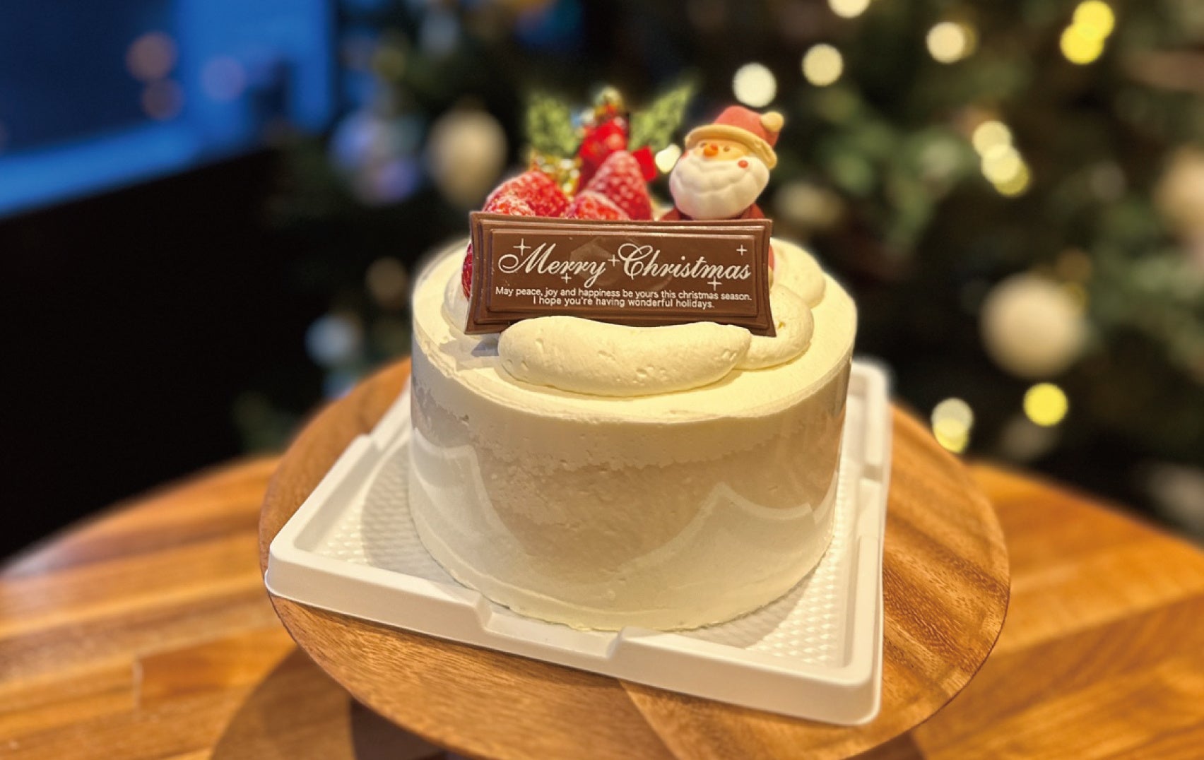 クリスマスケーキは、タバードの朝食パンで大人気の地元すみだのイタリアンレストラン❝Tomtom❞のもの。懐かしさを感じるレトロでかわいい見た目はもちろん、すっきりとした程よい甘さの生クリームと口どけの良いスポンジが魅力。毎年この時期に試食させていただくスタッフ全員みんな大ファンのケーキです。