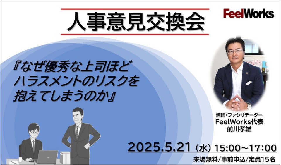 研修事業と出版事業を営む株式会社FeelWorks(代表取締役:前川孝雄、本社:東京都中央区、以下FeelWorks)は、企業人事・経営・管理部門の方々に向けて、職場課題をテーマにした意見交換会を5月21日(水)に開催します。今回のテーマは「上司のハラスメント」。代表前川のミニ講義をベースに、ご参加の皆様に意見交換いただきます。