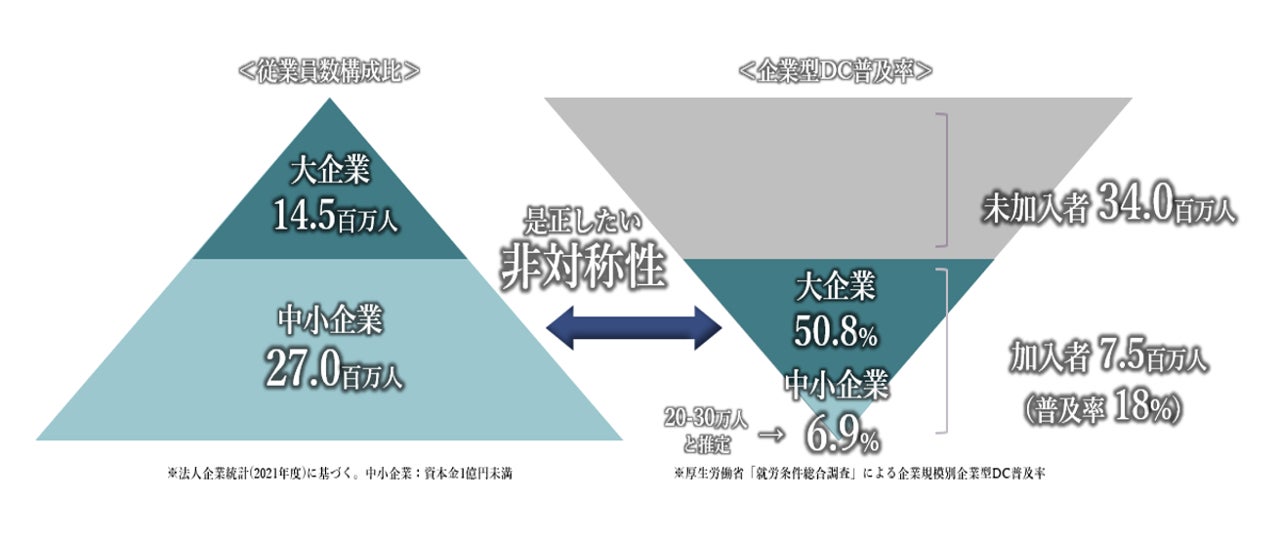 NVICと岡三証券は、このように日本全体の約65%(従業員構成比)を占める中小企業への導入が6.9%にとどまっている「非対称性」(※3)を憂慮しており、国民の資産形成の手段として有効な企業型DCを中小企業等の皆様にも広くお届けしたいと考えています。そしてこのことは、人的資本への投資という観点で、資産運用立国を目指す我が国の課題解決(SDGs:金融サービスの不平等是正 ESG:人的資本投資)にも資する取り組みであると考えています。