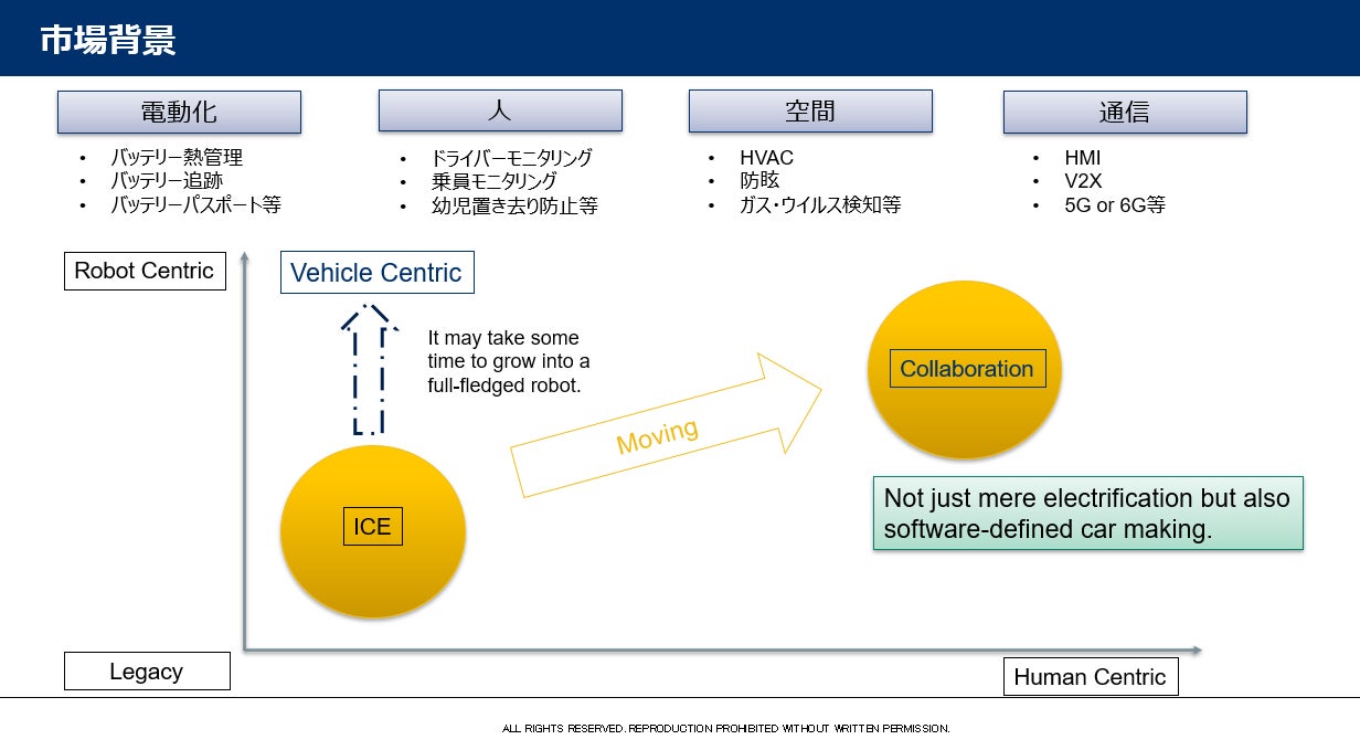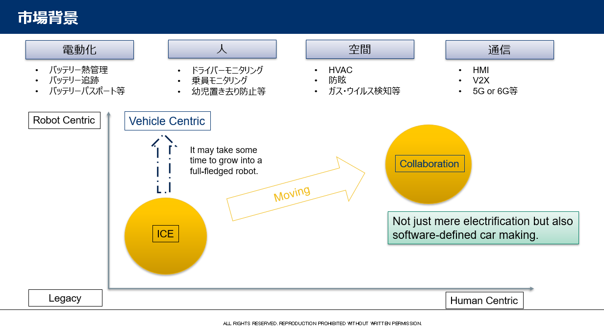 先進運転支援システムや自動運転に関わる分野の技術進歩は目覚ましく、センサーを駆使したシステム構築がトレンドになっています。自動車技術は従来、「走ること」に重きが置かれていましたが、「車の中で過ごす空間を最適化する」ことも昨今、フォーカスされるようになっており、AIやソフトウェア技術の進化とともに、ドライバー・モニタリング・システムや乗員監視システム、HVACシステム、HMIシステム等が導入され、車載インテリアのスマート化を牽引しています。また自動車の電動化が進むにつれ、電気自動車におけるエネルギーマネジメントの重要性も増しており、バッテリーのモニタリング技術の開発も加速しています。