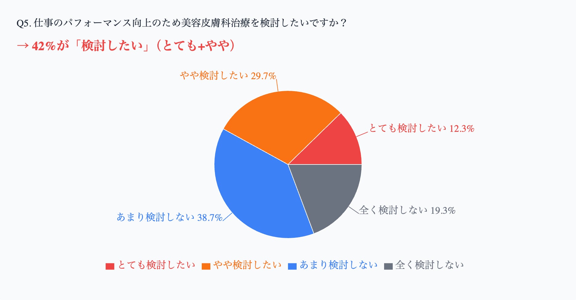 その結果、「検討したい」と回答した方は約42%。仕事とプライベートの両面で充実したいと考える20代女性にとって、肌の悩みを根本から解決する美容皮膚科治療へのニーズが高いことが分かりました。