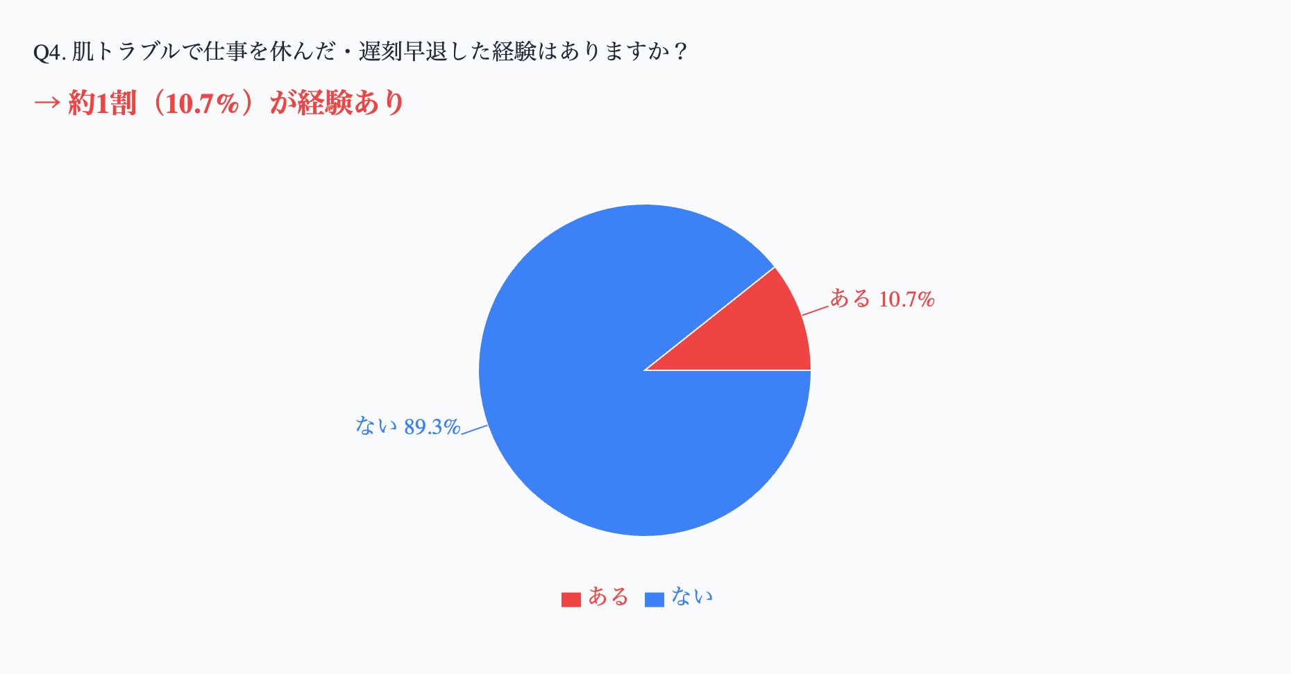 その結果、「ある」と回答した方は約11%。少数ではありますが、肌トラブルが仕事を休むほどの深刻な悩みになっている実態が明らかになりました。