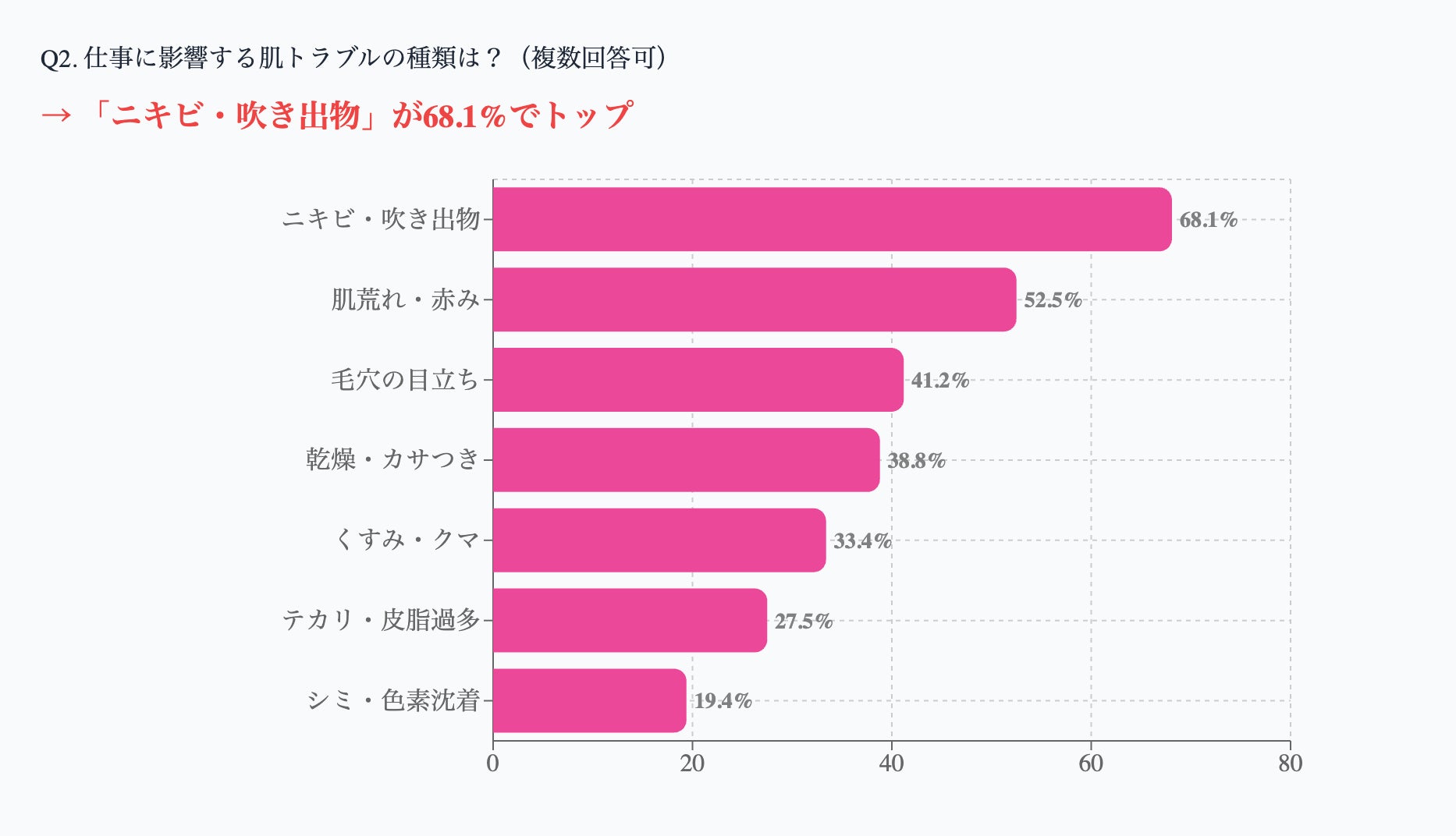 その結果、半数以上の方が肌トラブルで仕事のパフォーマンスが低下していると感じており、特に「ニキビ・吹き出物」に悩む方が多いことが分かりました。