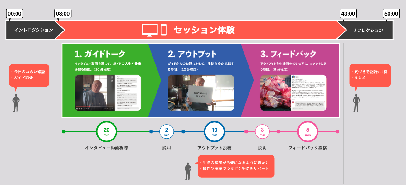 登場する大人の生き方・考え方をインスピレーションに、生徒一人一人が問いと向き合い自分の考えをアウトプットし、全国の10代の考え・アイデアにふれてフィードバックを行い、学びの振り返りを行うというサイクルで授業実施ができることが特徴です。動画とプラットフォームで一連の流れが体験できるので、授業進行の負荷も低く抑えることが可能です。