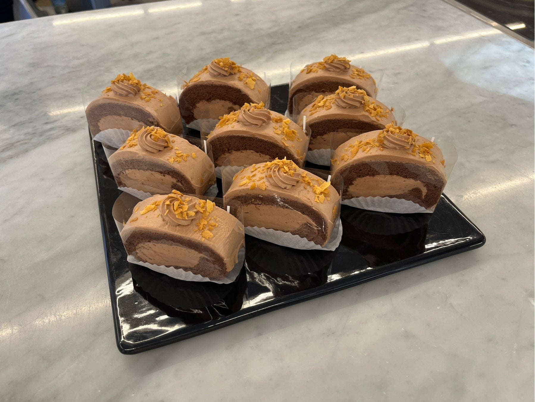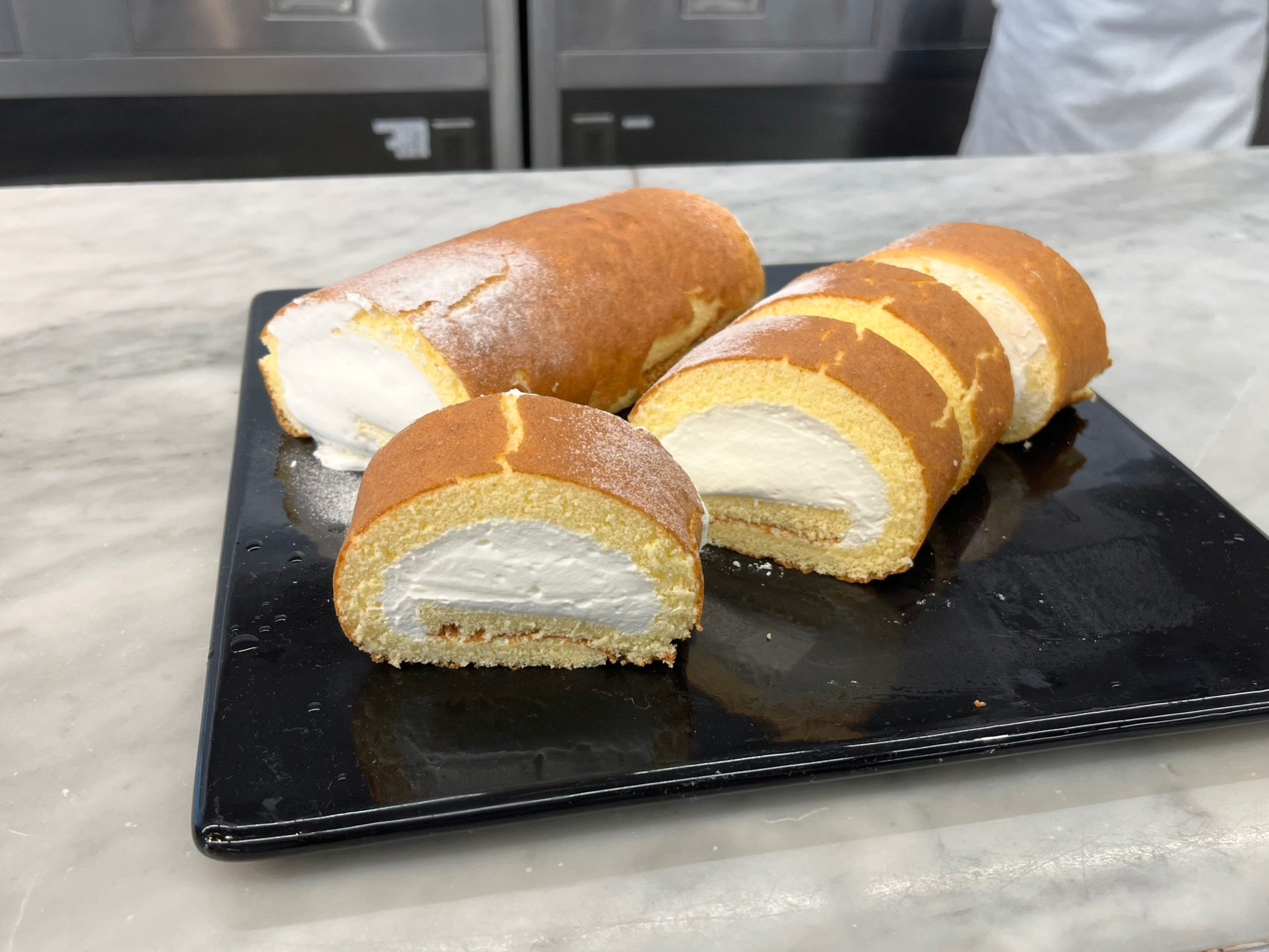 そこから、丸型が変形して、長方形の方に流し込みロールケーキを作っていきます。