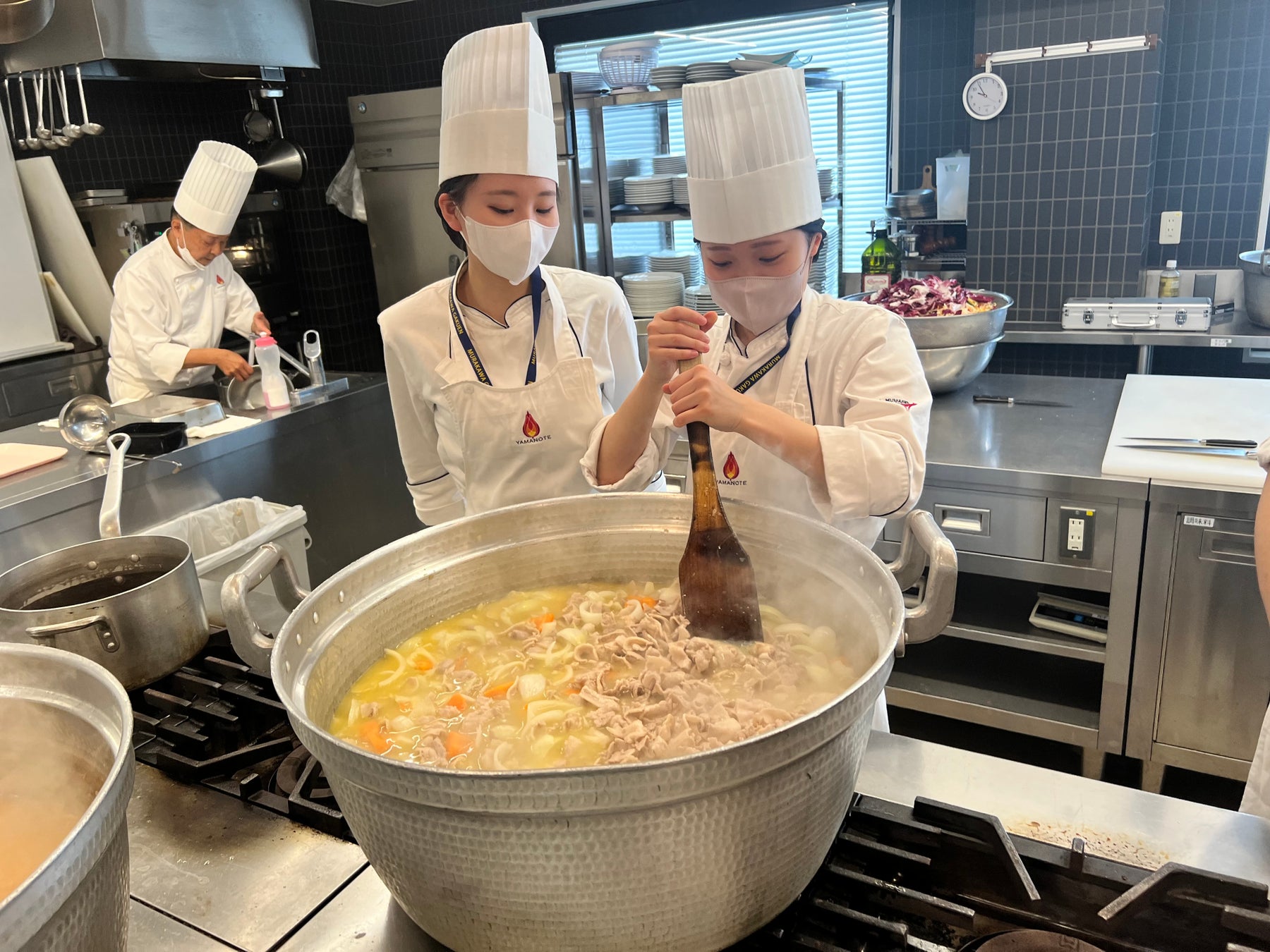 バンケット実習は大量に作るということだけでなく、一緒に作る仲間たちとの連携がとても重要です。