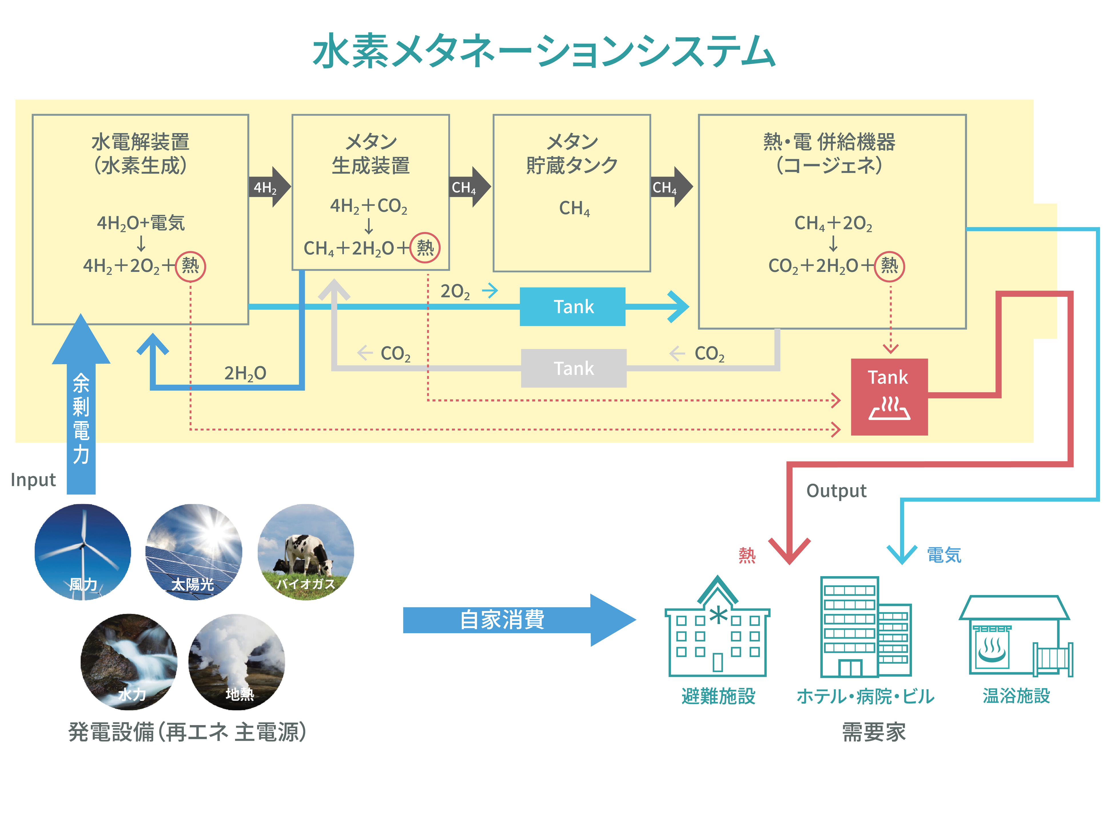 メタネーションに必要なCO2をメタン燃焼から回収・貯蔵することで、完全なエミッションフリーを実現しました。このCO2のクローズドループシステムは、特許を取得しております。
