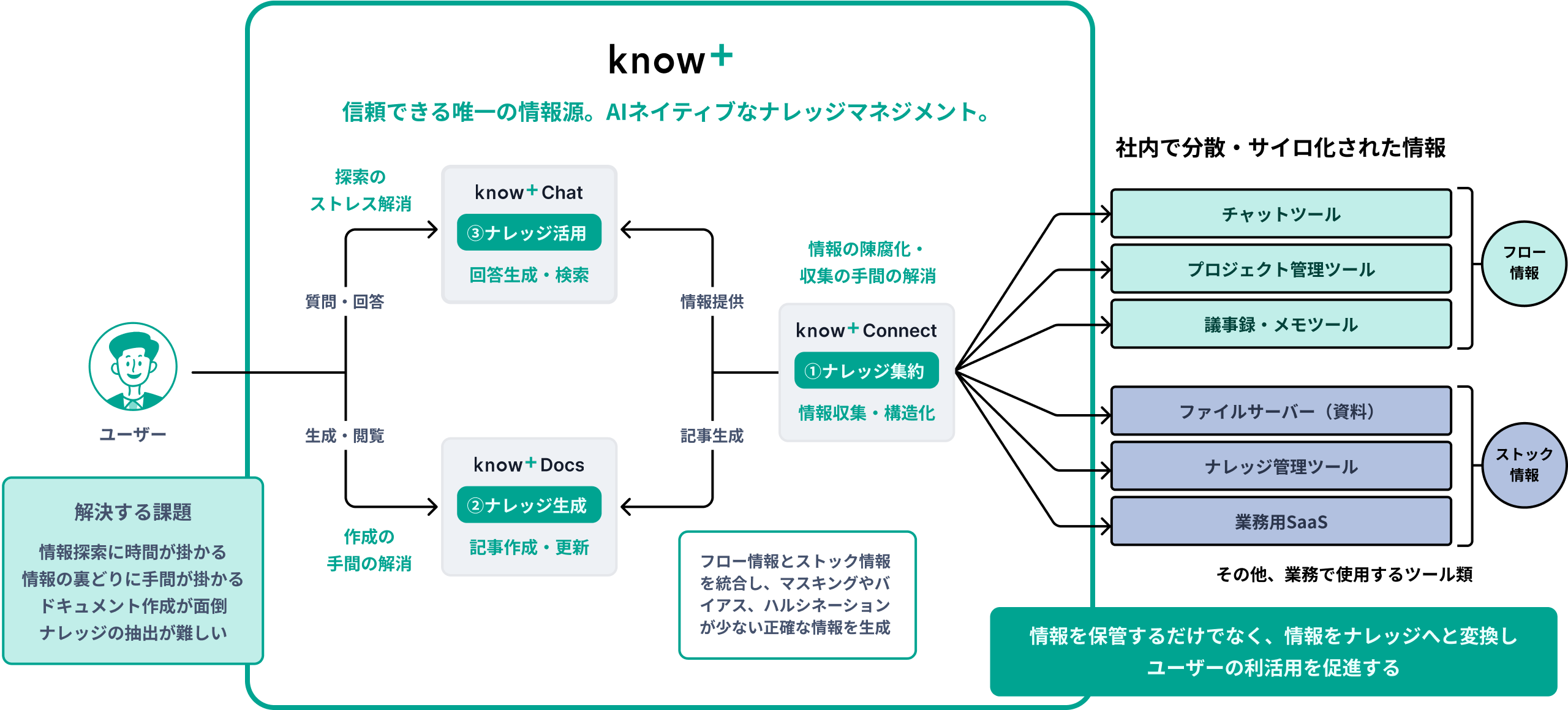 「流れて消える」会話やメールも、資産に変える(Flow into Knowledge): フロー情報もストック情報も統合してナレッジ化。