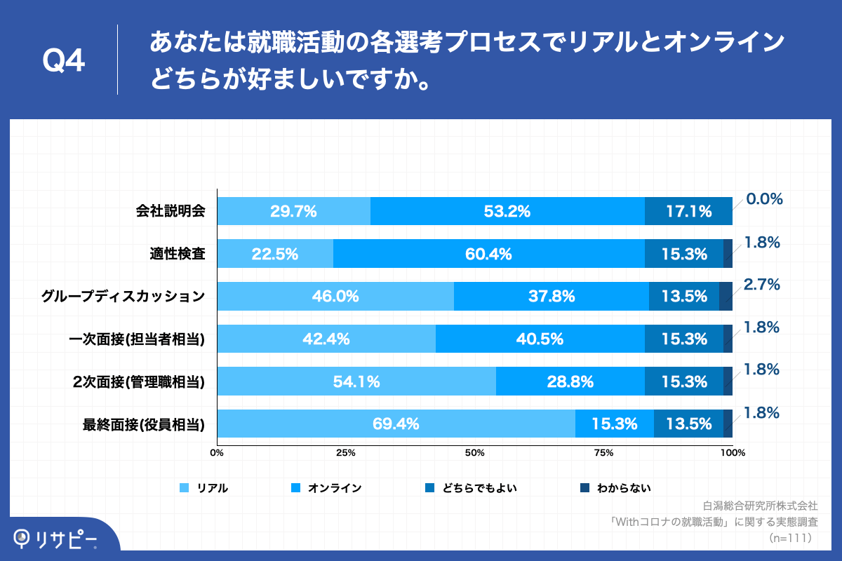 - 就職活動の各選考プロセスで、69.4%が「最終面接(役員相当)はリアルが好ましい」と回答