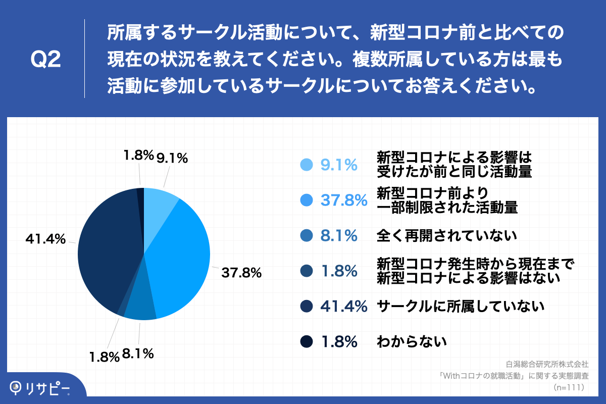 - サークル活動は、約4割がコロナ前と比べて「一部制限された活動量」