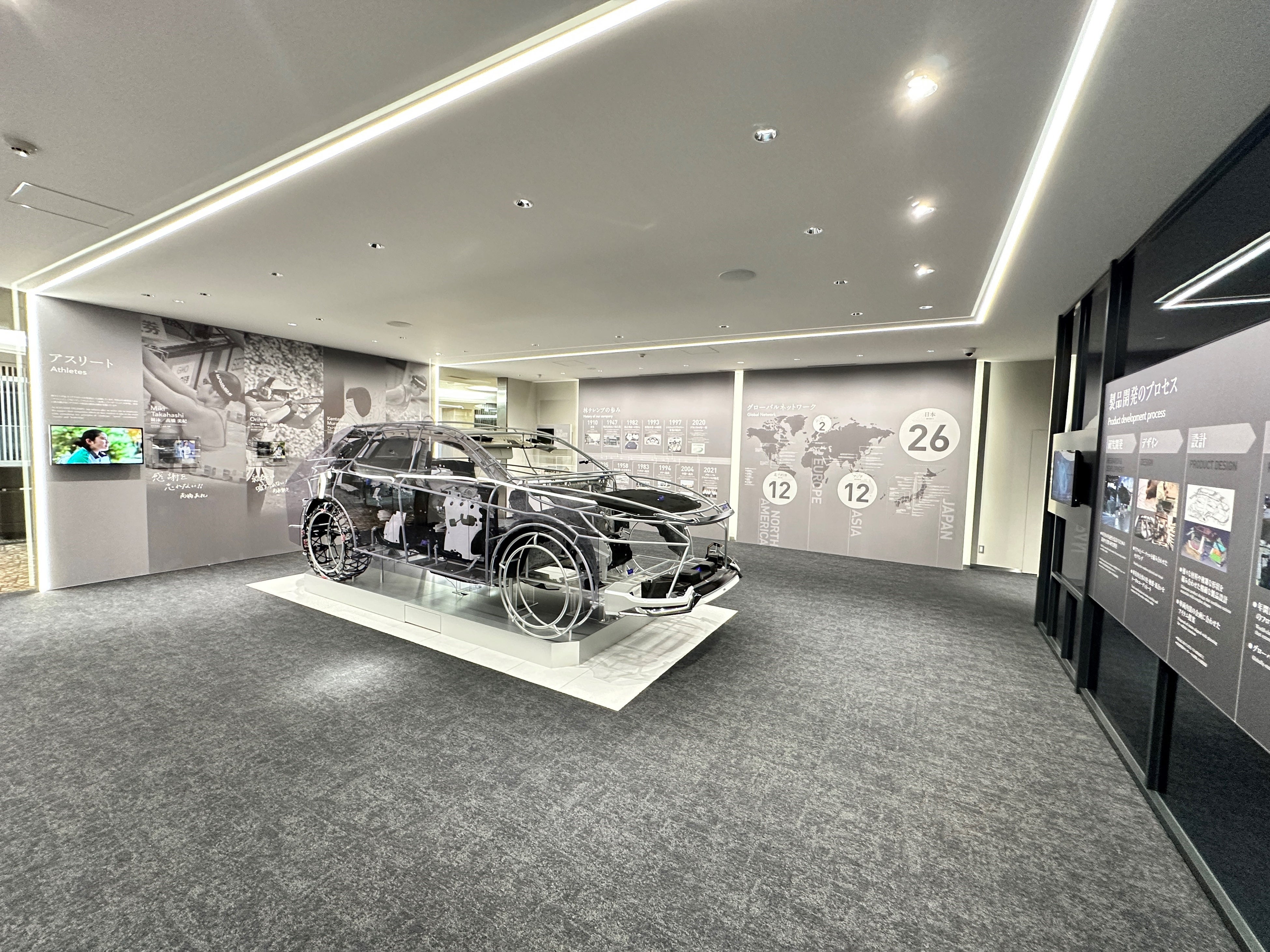 中央に設置したワイヤーフレーム構造の実寸大車両モックをはじめ、当社の歴史や開発プロセスなどを紹介した壁面グラフィックを通して、林テレンプの魅力をぜひご体験ください。