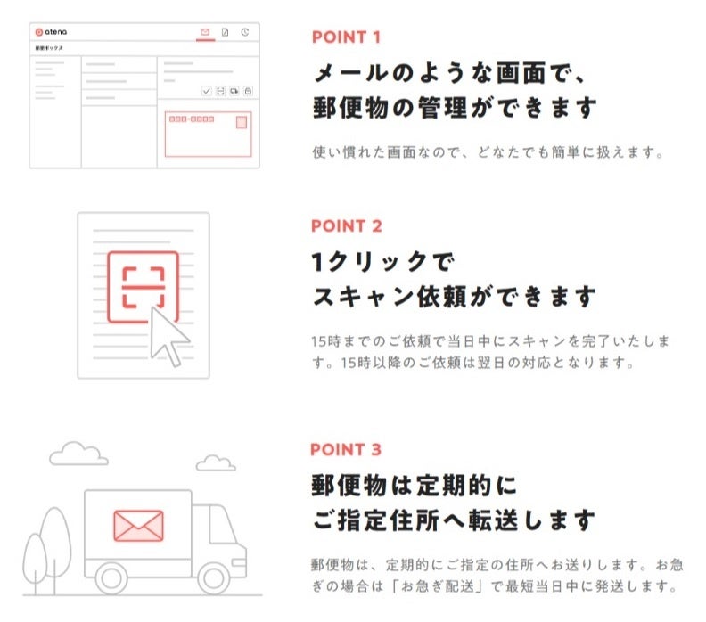 「atena」は、会社に届く郵便物を全て電子化することで、PCなどの端末から郵便物の内容を閲覧できるサービスです。リモートワークが進む昨今、「郵便物の確認」のためだけの出社から社会を開放するクラウドサービスです。郵便物の受け取り・管理・スキャニング・不要な郵便物の処理などの作業を、全てシステムで一元管理することが可能です。