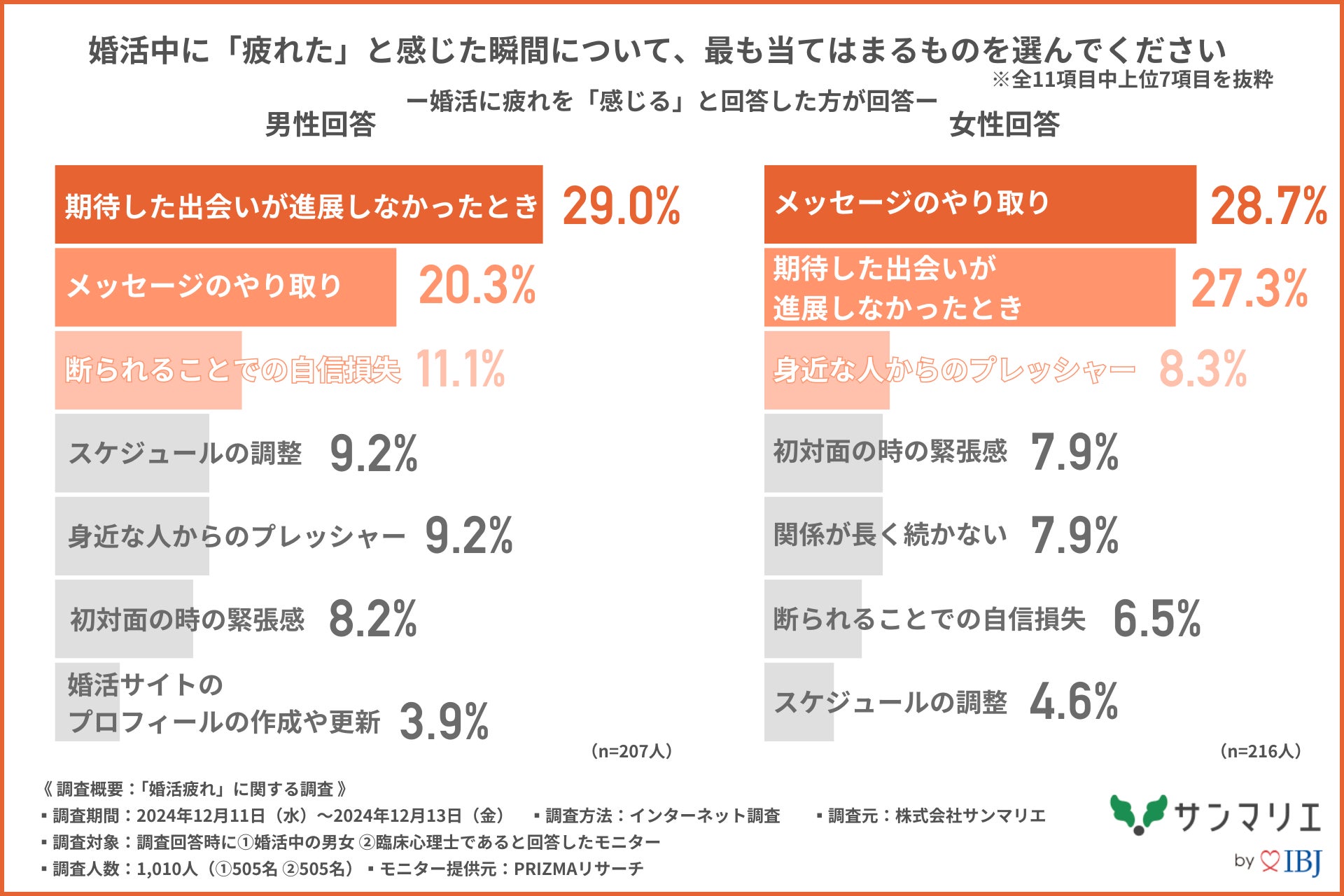 婚活疲れの主な要因として、男性は「期待した出会いが進展しなかったとき」、女性は「メッセージのやり取り」が最多になり、婚活の進展に対する焦りや、相手とのコミュニケーションにおける負担が大きいことがうかがえます。