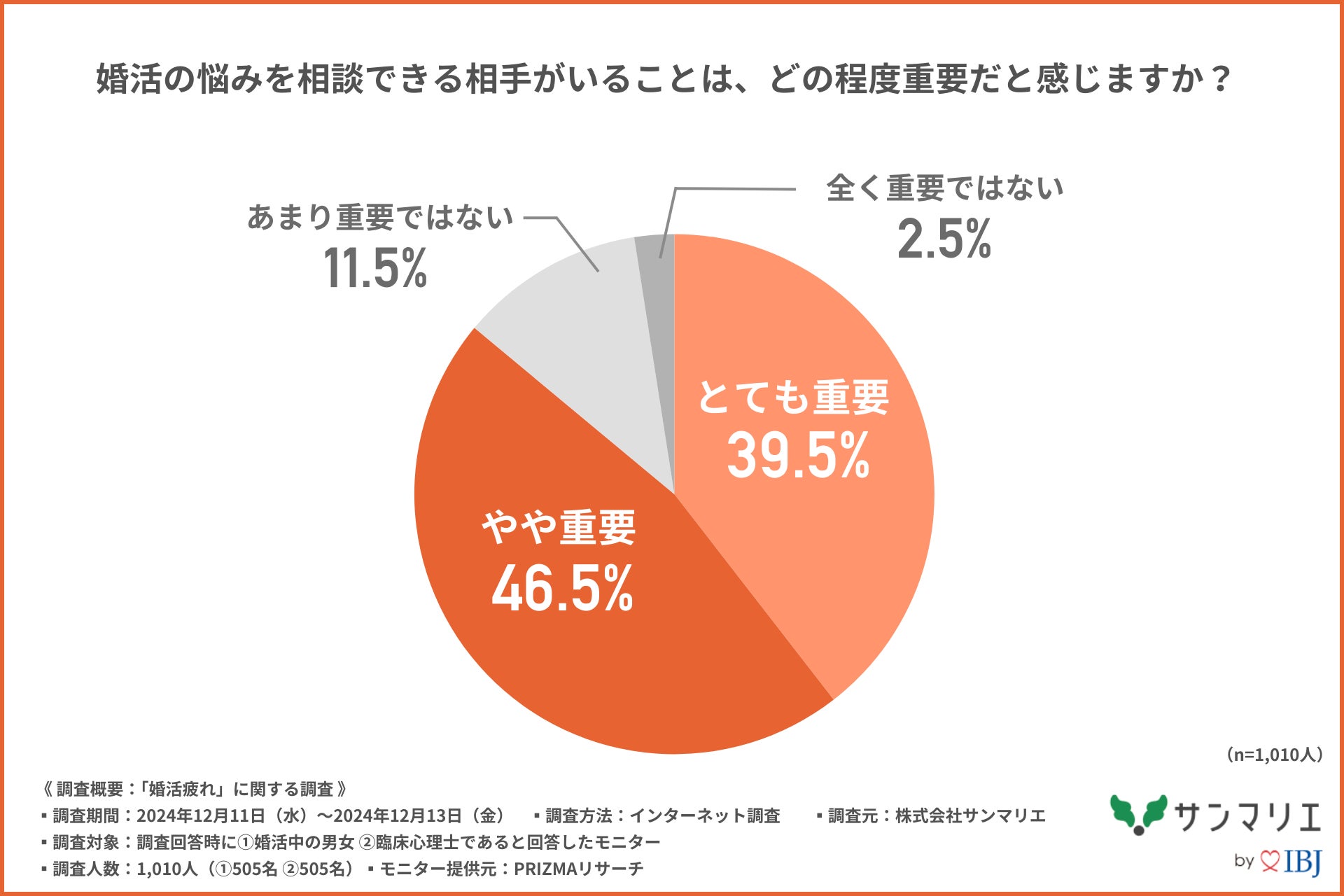 相談することや気分転換、自己分析の機会を作ることで心理的負担を軽減し、自分の状態を見直す機会を持つことが効果的だと示されましたが、婚活の悩みを相談できる相手がいることの重要性を感じている方はどの程度いるのでしょうか。