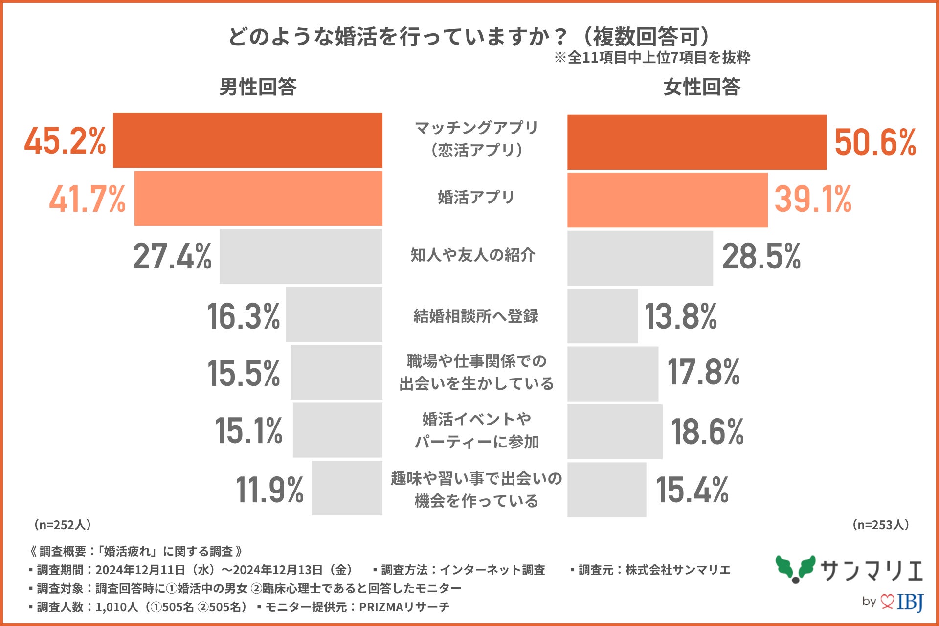 男女ともに婚活アプリやマッチングアプリが上位になり、オンラインツールが主流となっているようです。