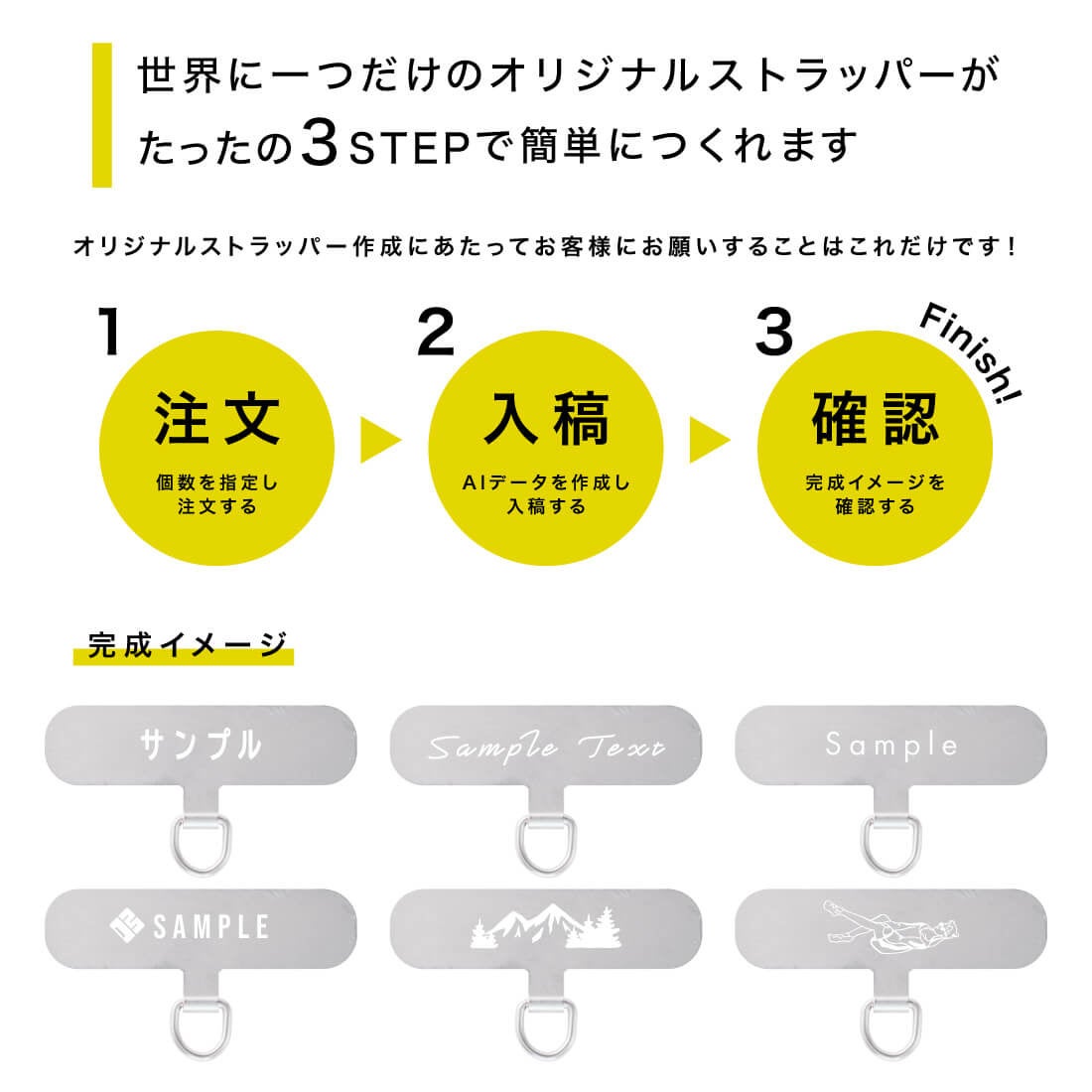 シンプルで人を選ばないデザインで、どのスマホにも合わせられるため、iphone・Androidなどの端末種類や機種関係なく使用できるので、ノベルティやイベントPR、記念品などにもピッタリです。また3ステップで簡単に作れる上に小ロットでの作成も可能なので、オリジナルグッズを作成したい方にもオススメです。