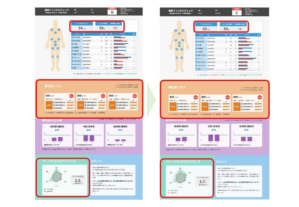 - フィジカル状態を点数化し、腰痛リスクや肩の痛みを%で数値化。