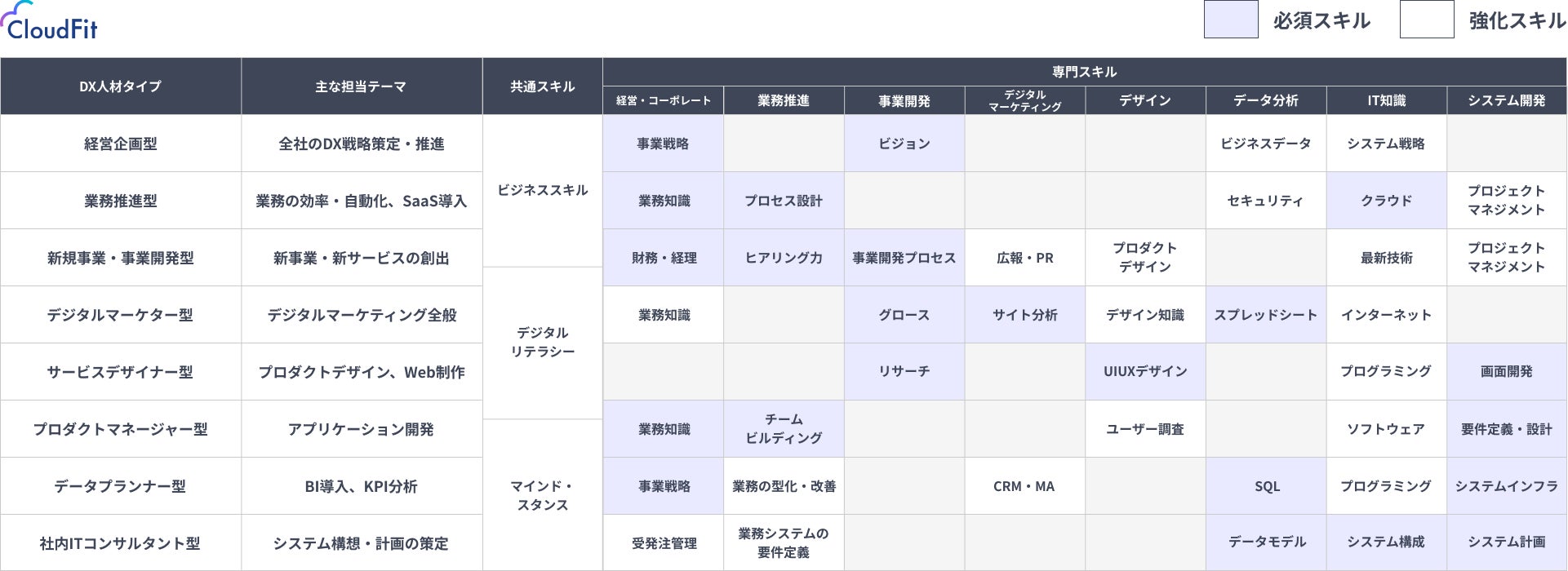 専門スキル:DX人材の専門性に関するスキルです。DX人材タイプごとに求められるスキルが異なります。