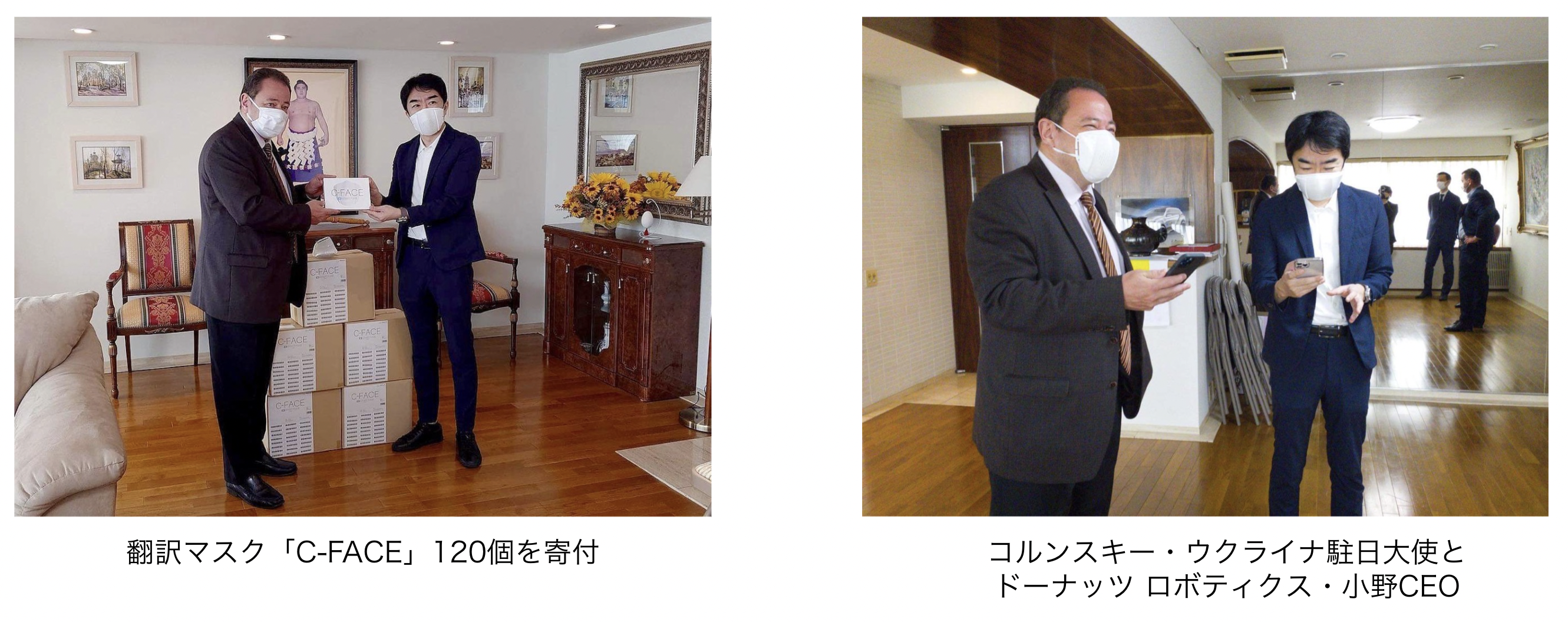今回のプレスリリースに先立ち、今月17日、ドーナッツロボティクスは、翻訳可能なスマートマスク「C-FACE」を、在日ウクライナ大使館を通じて 120個を無償で提供しました。駐日ウクライナ大使にも使用いただき、「価値あるデバイスである」との評価をいただきました。また今後の取り組みについて議論させていただきました。