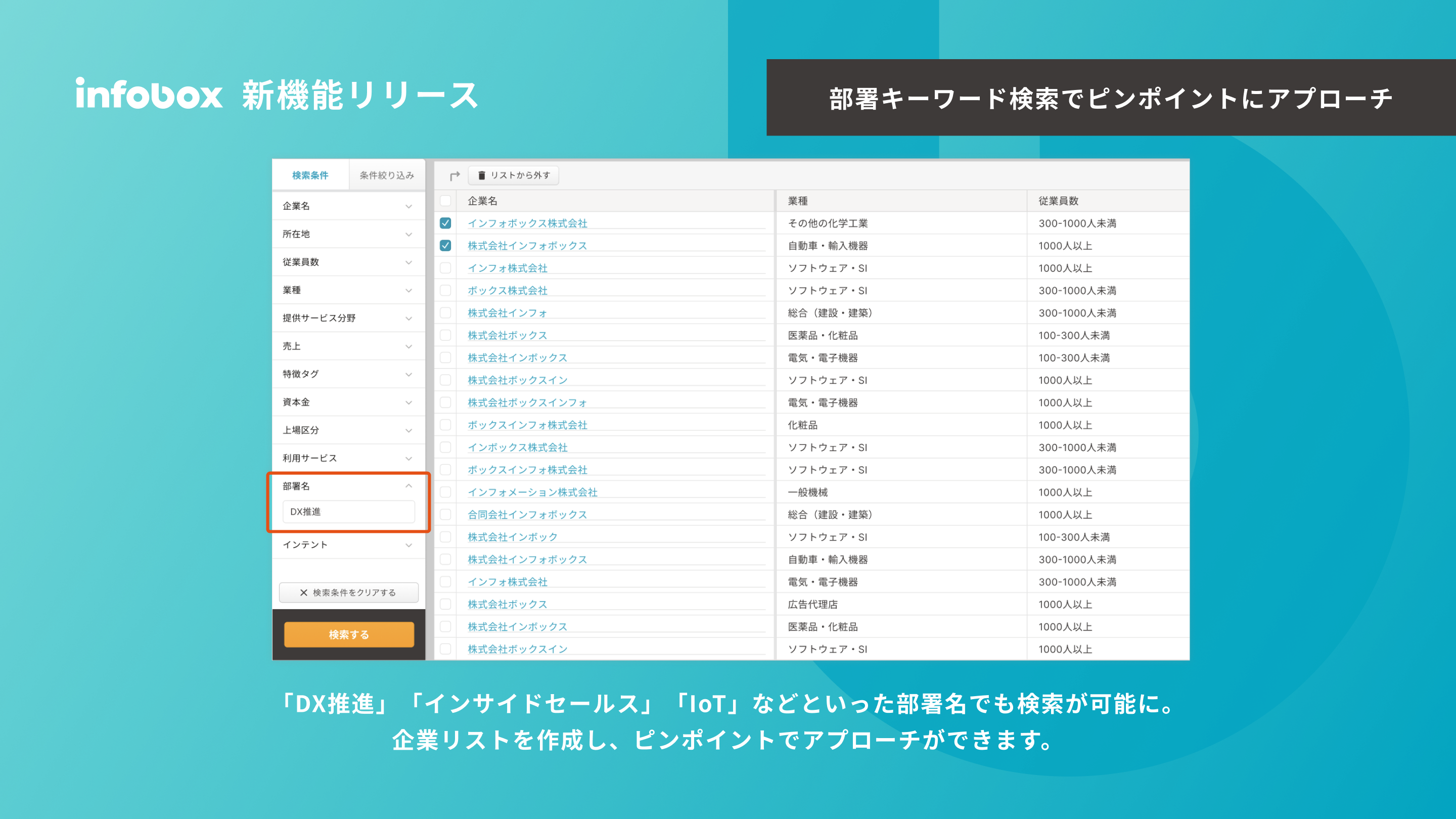 例えば、「DX推進部のある企業を検索したい」「インサイドセールス部門のある企業のリストを作りたい」といった目的にご活用いただけます。