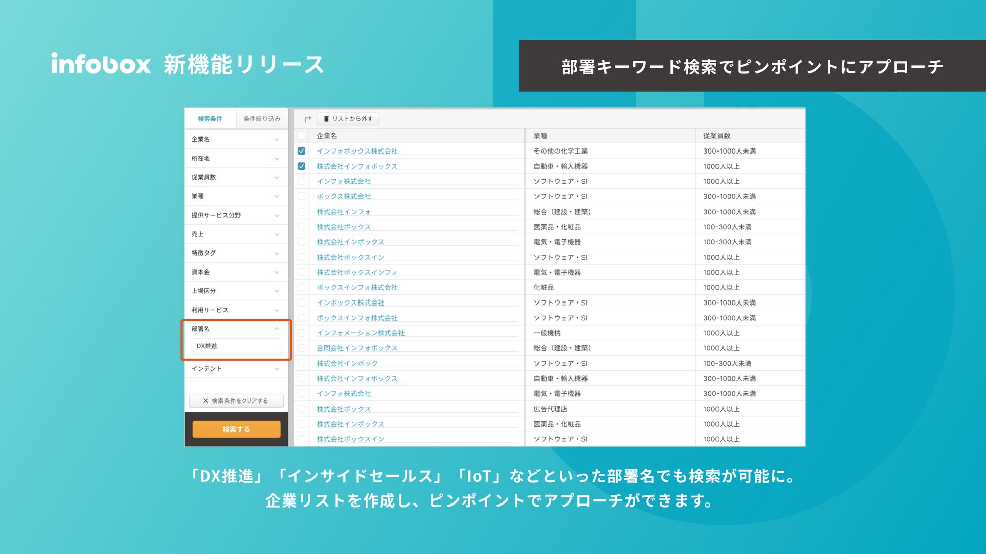 ・自社の製品が解決する課題のキーワードやソリューションのキーワードで企業を検索。該当する部署のある企業リストを作成できます。