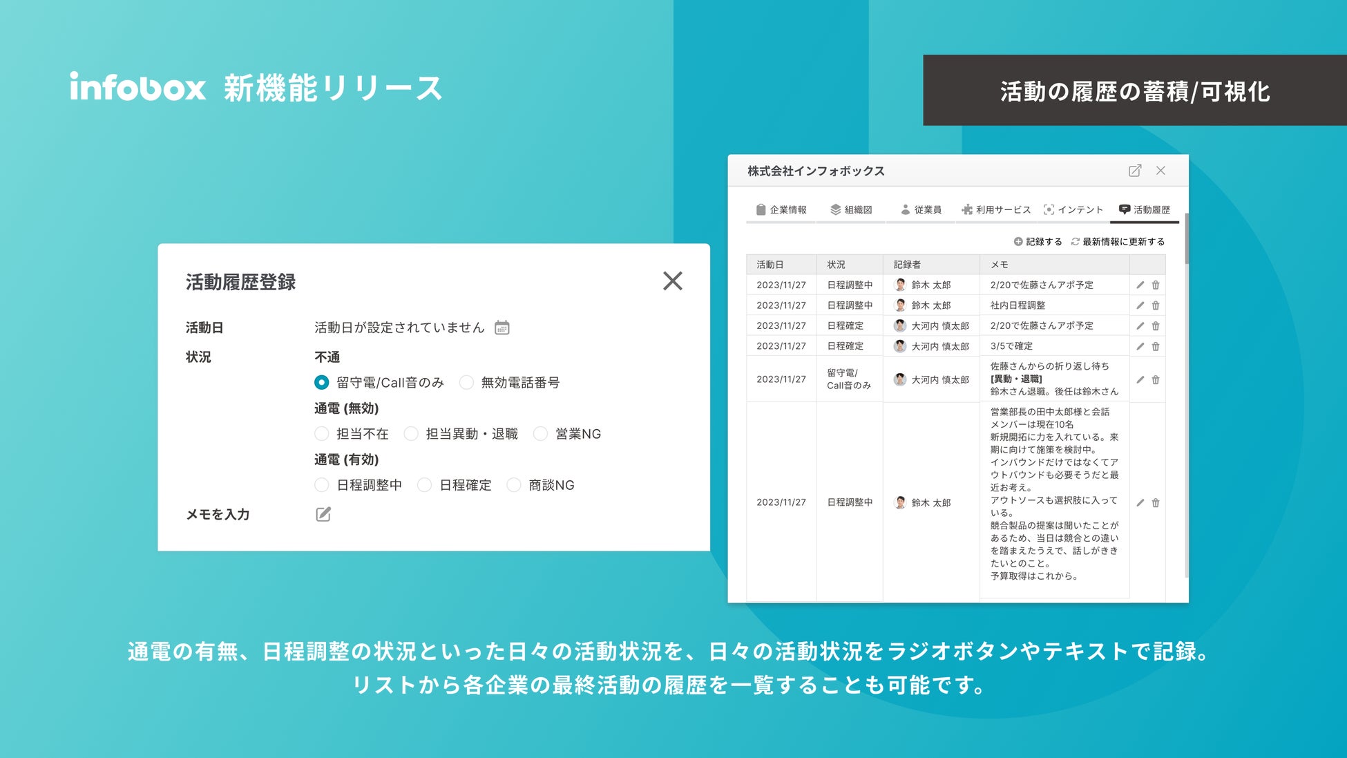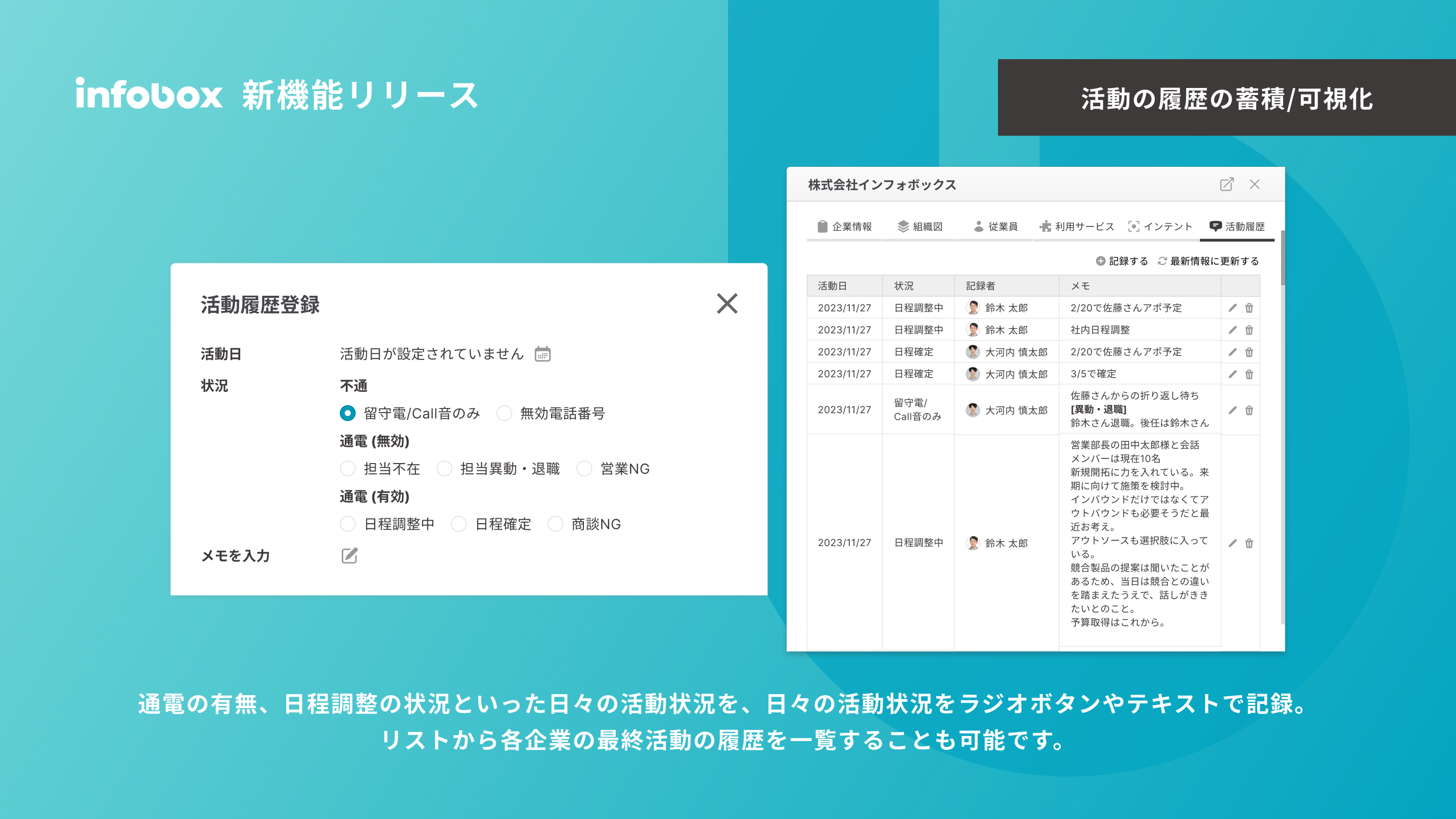 アポイントがとれる前、担当者の方のリード情報を獲得する前の活動をCRMに入力しはじめると情報量が多くなってしまうのでinfoboxに記録できて助かってます。