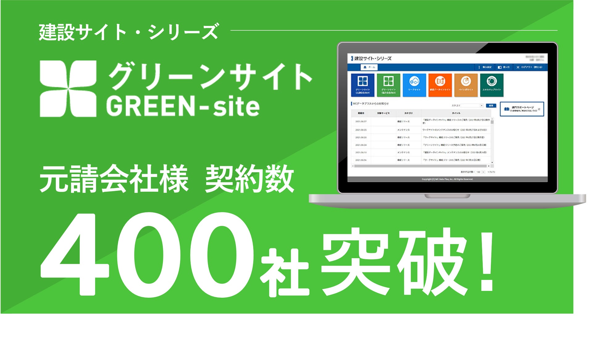 株式会社MCデータプラス(東京都渋⾕区、代表取締役社⻑:飯田 正生)が運営する「グリーンサイト」を中心とした建設業向けクラウドサービス「建設サイト・シリーズ(https://www.kensetsu-site.com/)」は、2022年5月末時点の元請会社契約数が417社となり、400社を突破しました。