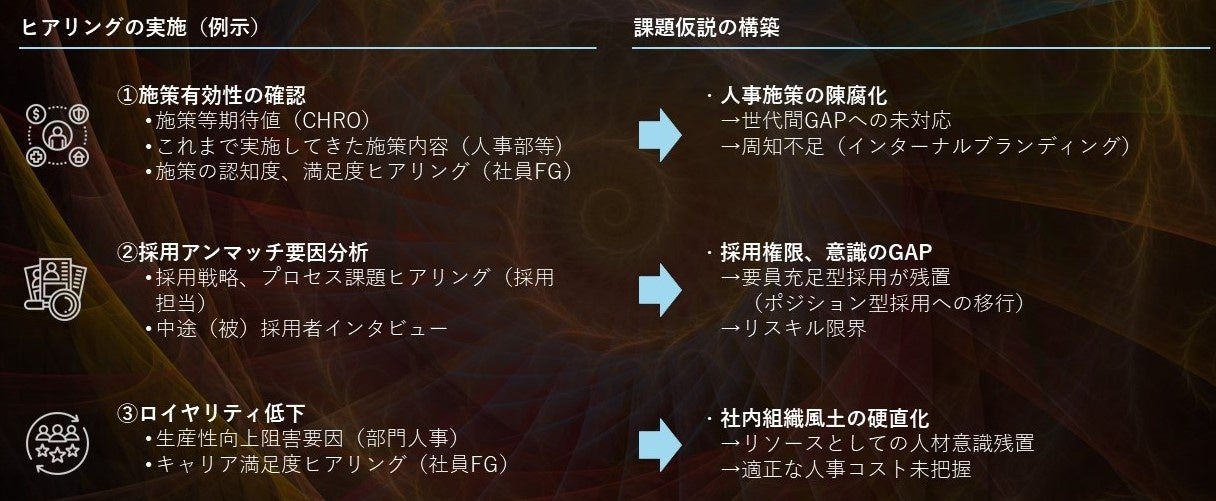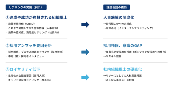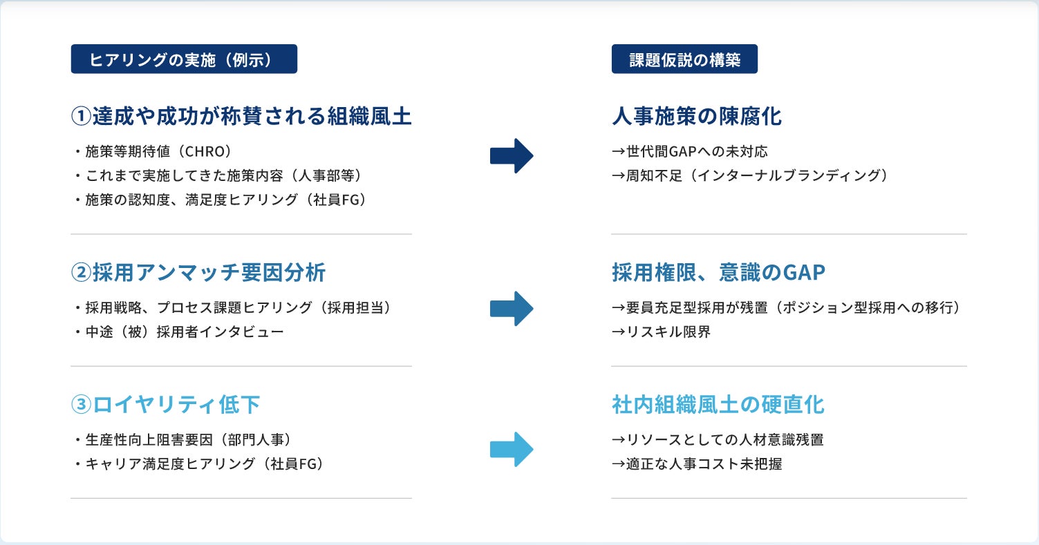 まず、当社独自の評価項目を軸に、現場と経営層の双方に対しヒアリングを実施します。両者の間に存在するギャップを抽出し、お客様が取り組んでこられたWell-being経営の課題仮説を構築します。