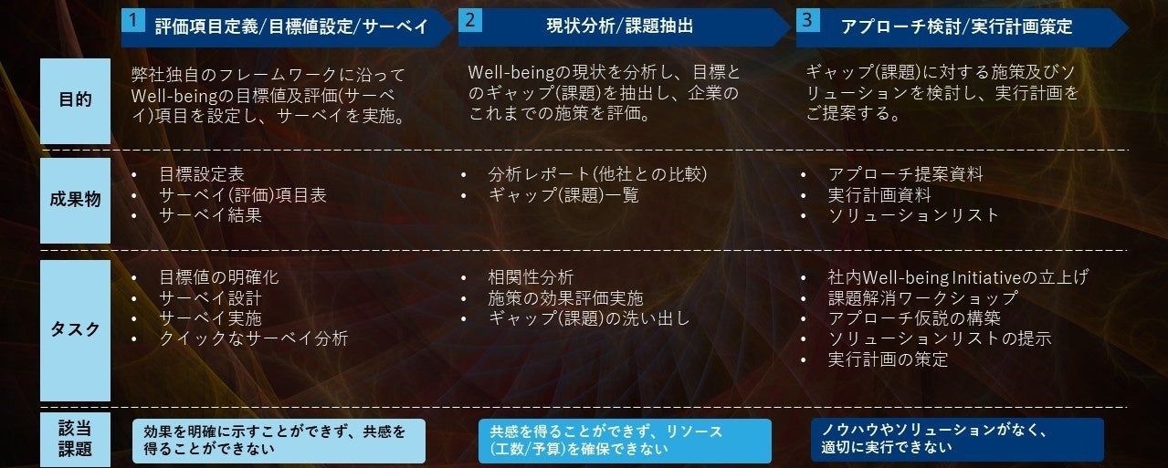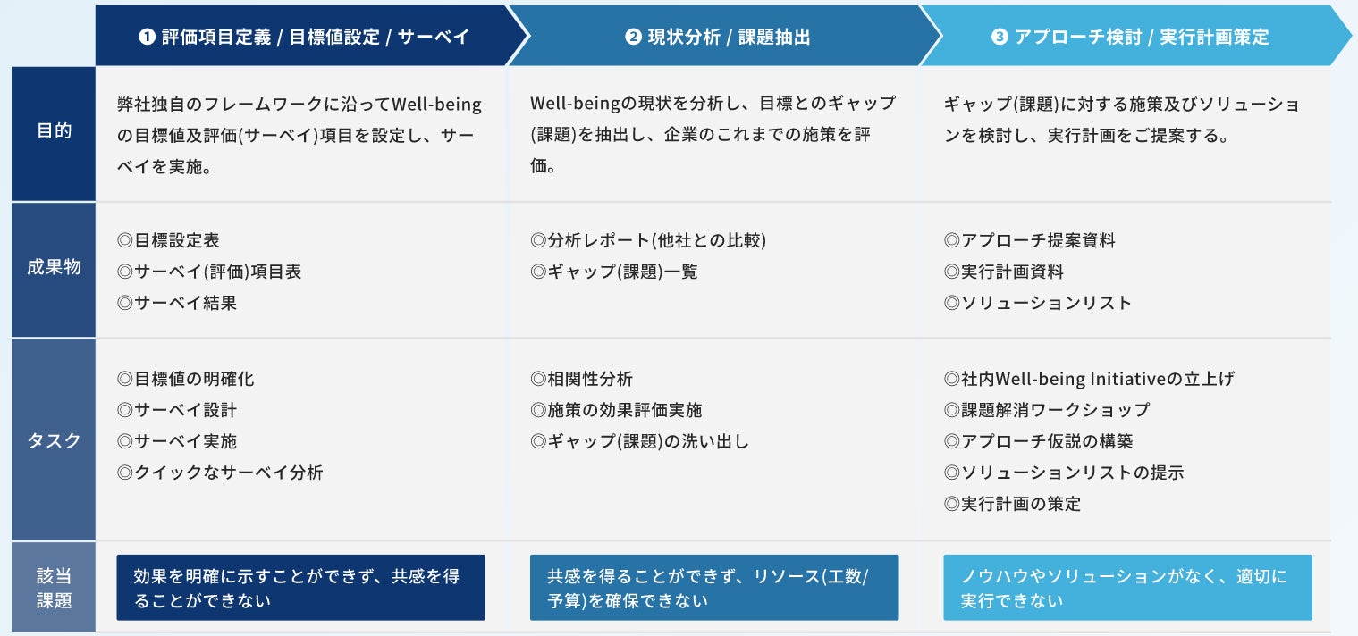 丁寧なヒアリングと分析を通してお客様の現状から課題を抽出し、ワークショップを通じて「共に」検討を進めながら、Well-Beingの実践までご支援いたします。