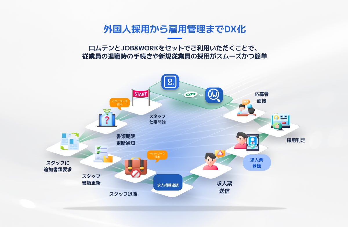 ロムテンが外国人労働者向け求人アプリ「JOB&WORK」とAPI連携されました。「JOB&WORK」で採用が決まった場合、API連携によってロムテンに採用された外国人労働者の在留カード等の情報がワンクリックでロムテンに連携されます。したがって、管理者が手動でデータを登録する必要がなくなります。これにより、企業は外国人従業員の在留資格や情報を即時に管理でき、採用から雇用管理までの業務をスムーズに行えるようになります。