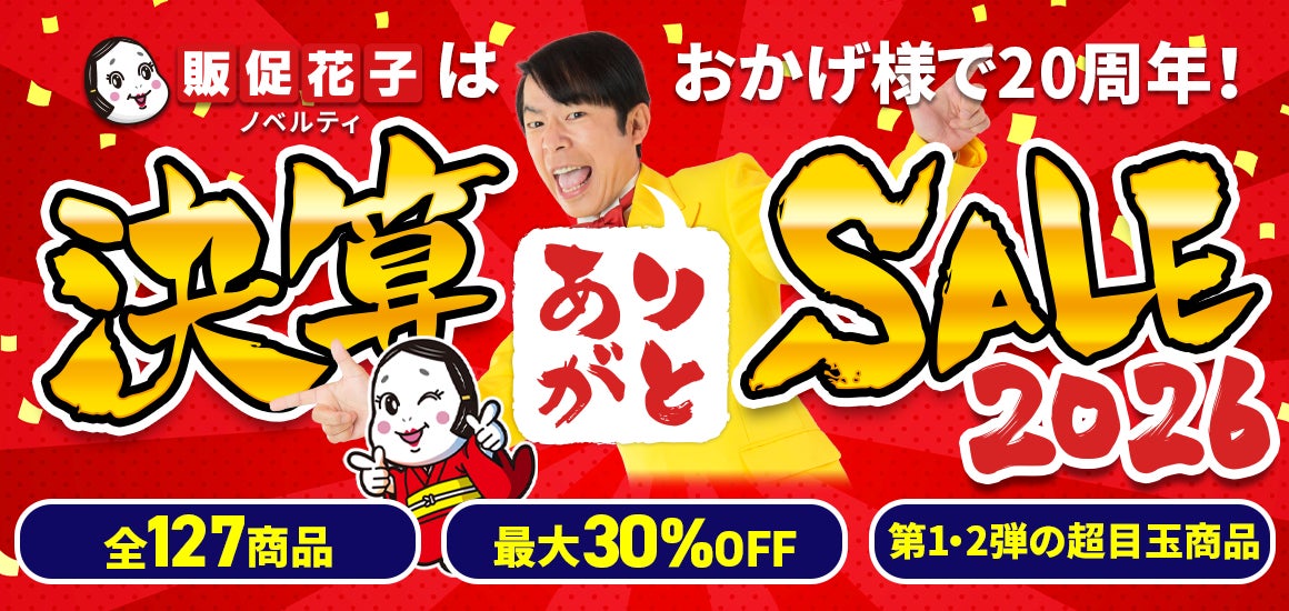 これまで多くの企業・団体の販促活動に販促花子をご利用いただいた感謝を込め、毎年実施している決算セールを、今年は20周年記念企画として大幅に拡充し、2026年1月7日(水)〜3月31日(火)までの期間限定で開催いたします。
