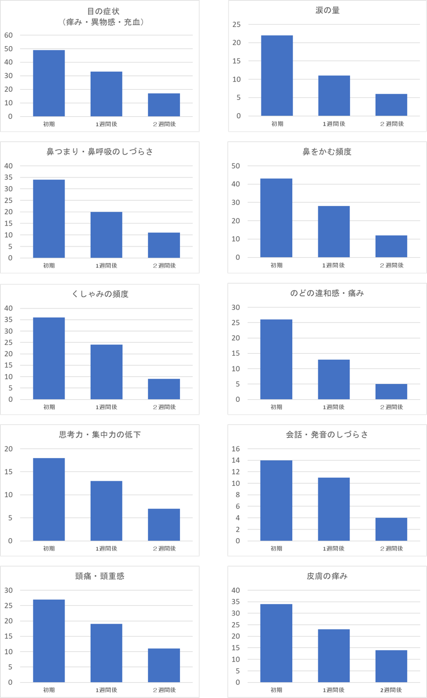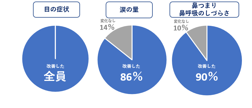 ・「目の症状」は全員が、「涙の量」「鼻づまり・鼻呼吸のしづらさ」については被験者の約9割が改善し、その他の自覚症状については全般的にすべての患者で改善の傾向が見られた。