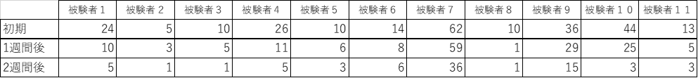 *11人の花粉症患者に小型光触媒除菌脱臭機を装着させて2週間後の花粉症の自覚症状を調査。