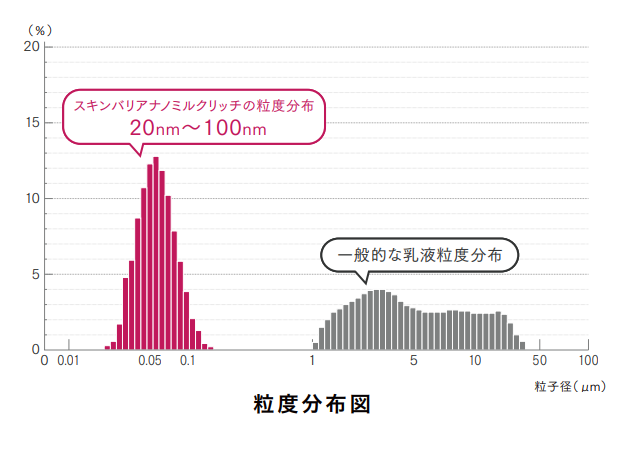 スキンバリアナノミルクリッチは配合率15%以上という超高濃度※ 5セラミド※ 1成分 、新たに配合した HA4※2、エクトイン※3、天然保湿因子(NMF)※7を丸 ごと深海レベルの高圧をかけてナノ乳化。高濃度なためナノ乳化工程を5回繰り返し、通常のエマルジョンと比べて100分の1の大きさの微細なエマルジョンへ。スーッと角質層の隅々に素早く行き渡り、うるおい成分が即働くよう、肌にしみ込む※4ような肌なじみを実現いたしました。