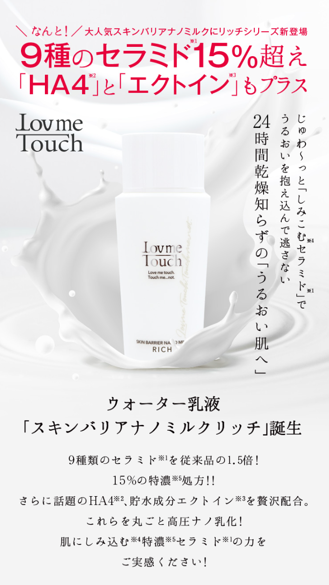 【新発売】『Lov me Touch(ラブミータッチ)』より、9種のセラミド※1が15%超え、HA4※2と エクトイン※3もプラス『スキンバリアナノミルクリッチ』2023年6月1日(木)発売開始!